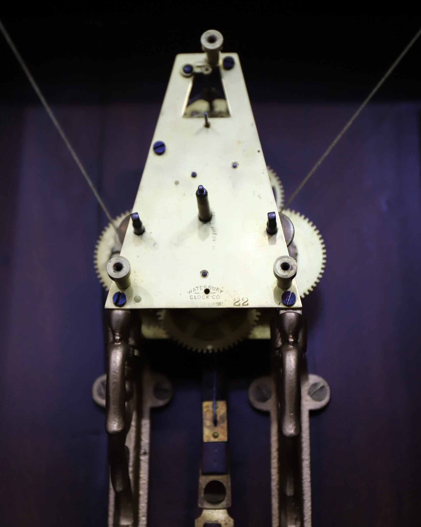 chipping and crazing. The Waterbury logo is bottom-center, the fancy hands are Waterbury issue. There is a seconds bit. The 8-day, time-only movement is driven by two brass weights that lack end-caps; the movement is attached to a mounting frame and