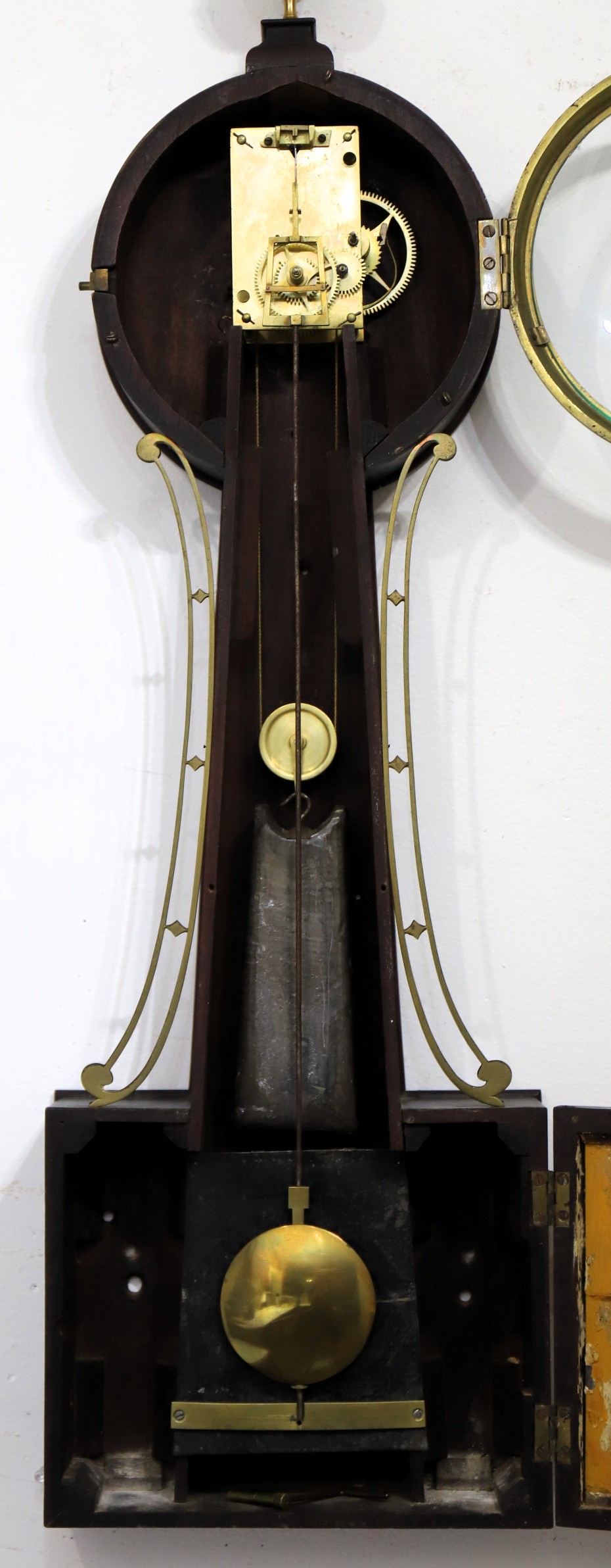 Jr (ibid., page 51). Both makers used T-bridge suspensions. There is a large brass pulley and a duck-bill lead weight. The tin weight shield is unmarked, the pendulum tie-down clip is missing. I see no markings on the case or frames but note that