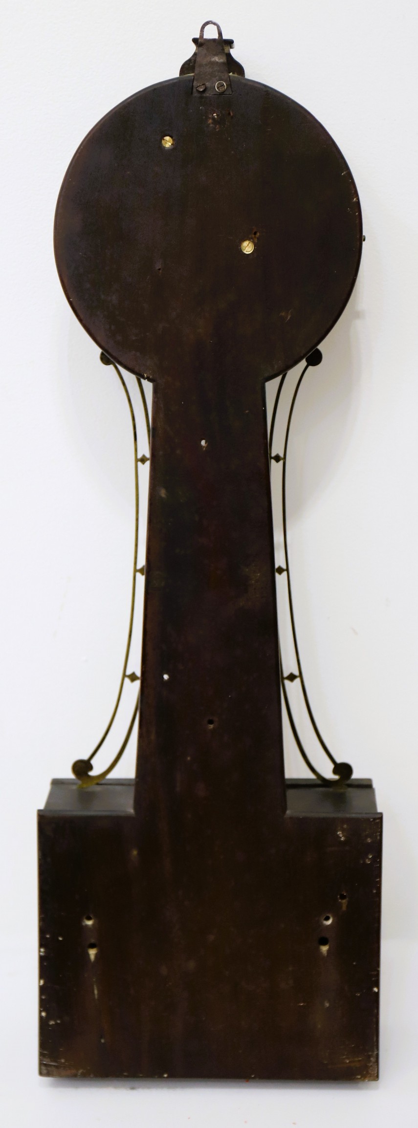 with an L-turn. The throat piece is mounted to the frame with two fillister head screws about two-thirds of the way down. There are brass side arms. The iron dial holds very old/original paint with some fading to the numbering; there is no indication