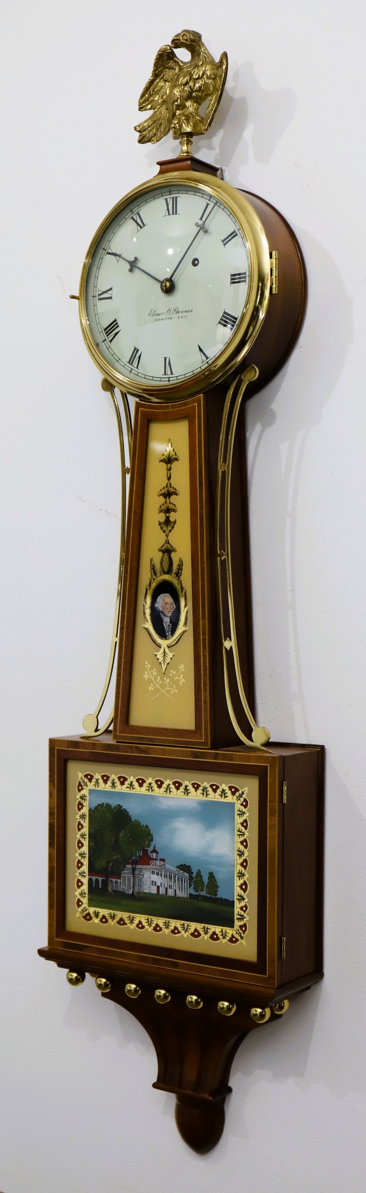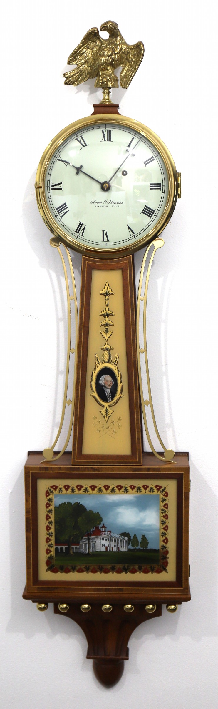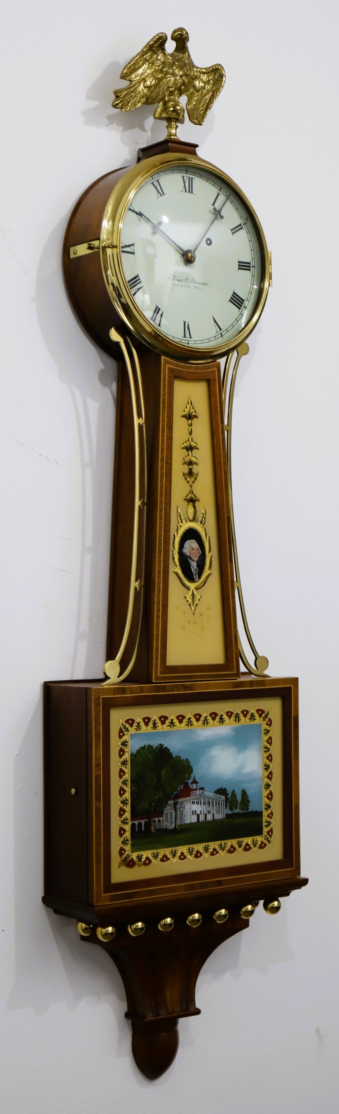 Washington and Mount Vernon. The dial is signed, the hands correct, and the 8-day time-only banjo movement is die-stamped for
