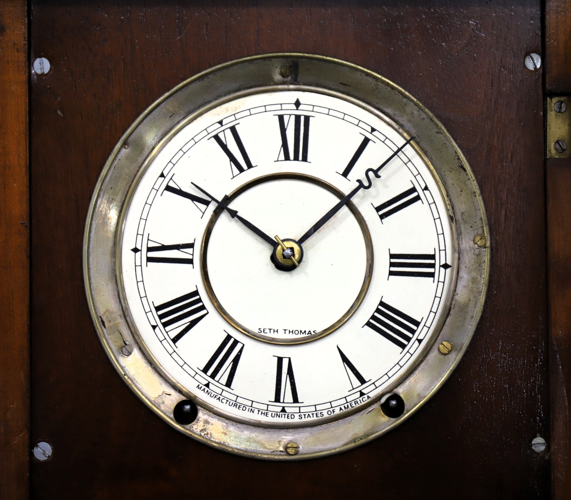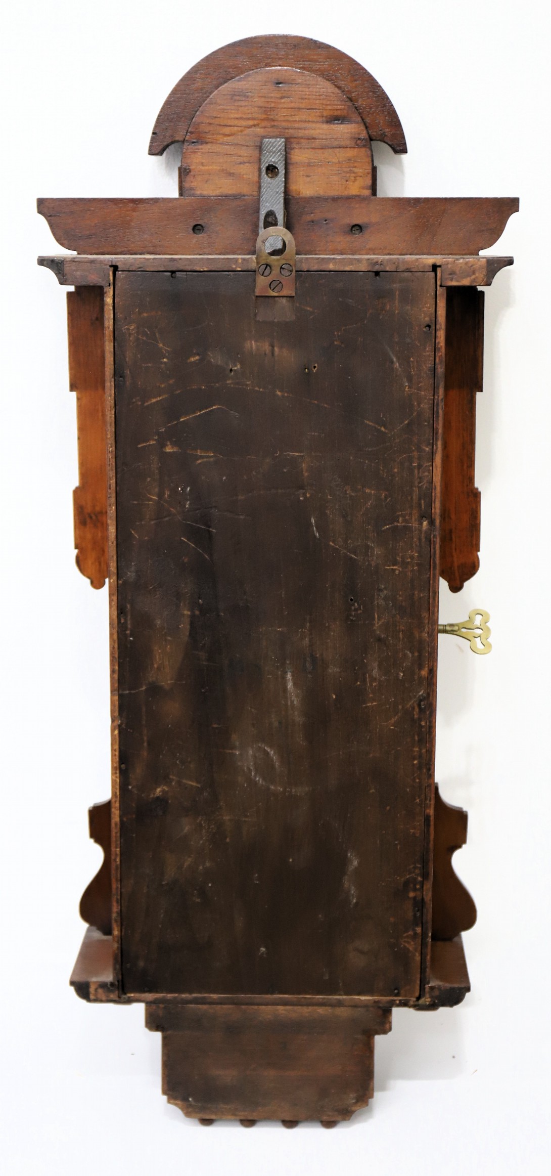 8-day, time-and-strike Seth Thomas movement is a bit oily and won’t run overnight, so a cleaning is needed. The damascened
