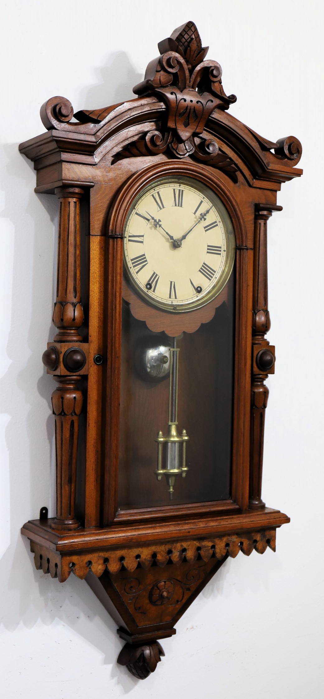 as an American Clock Co. label. The 37-inch walnut case has a clean finish and burl veneer on the base. The glass is original,
