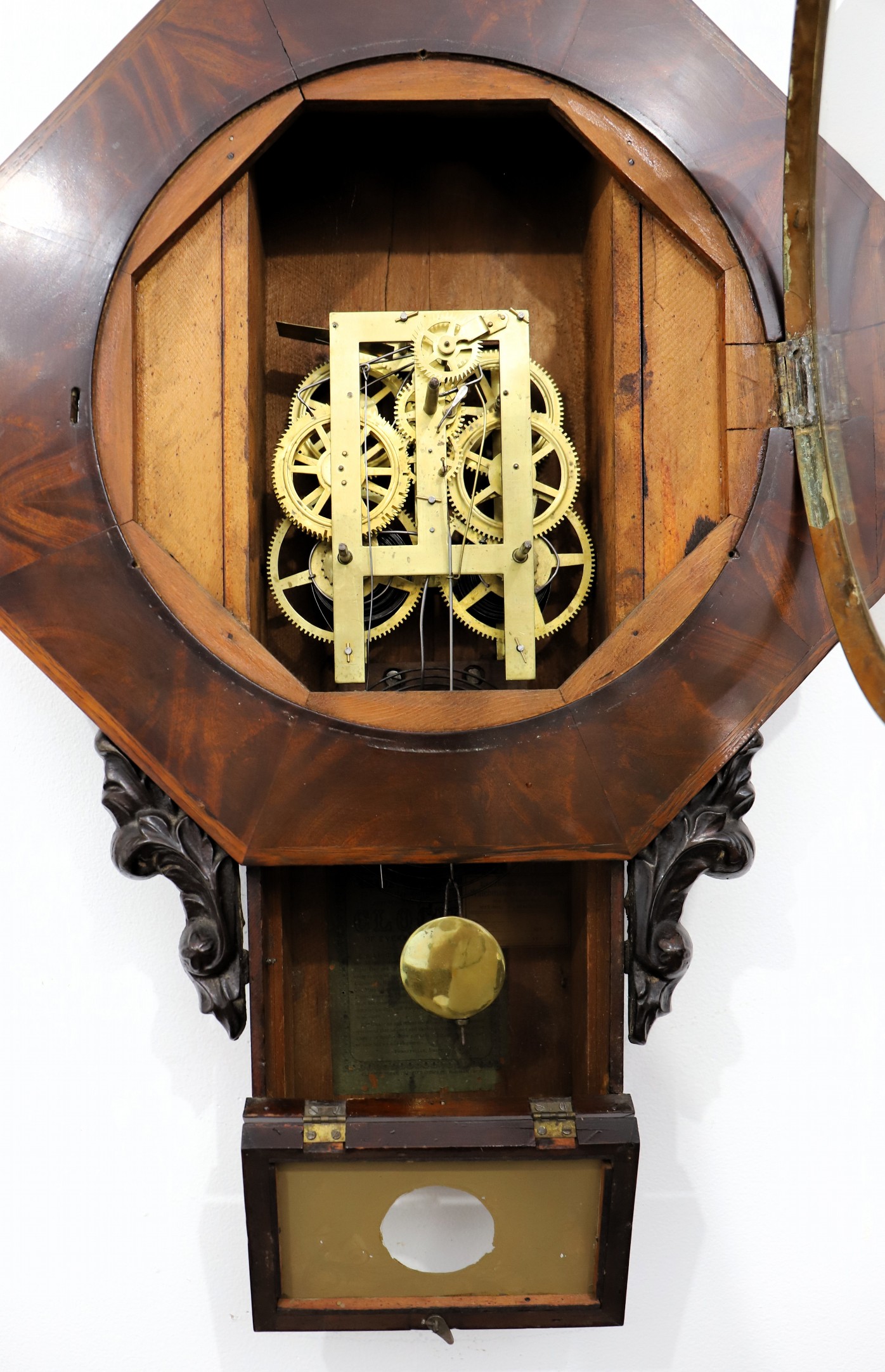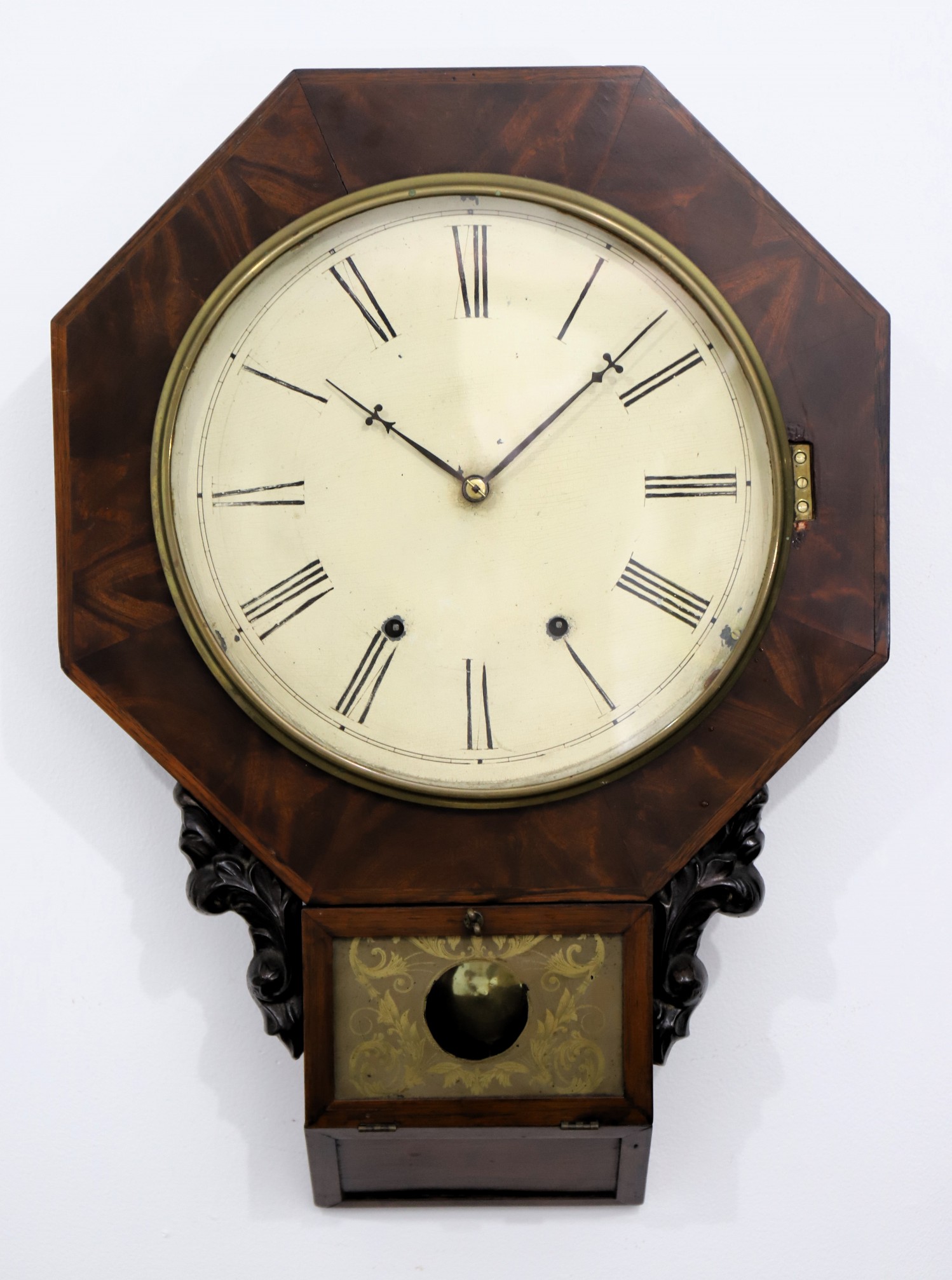 Chauncey Goodrich “Octagon Drop”, ca. 1854. A 24-inch case with good burl mahogany on the front. Both glasses are original, with a well-preserved tablet in the pendulum door. Note the carved “ears”. The painted dial likely holds the original paint, in good condition, and the hands are likely original. The 8-day time-and-strike movement is unsigned; it is running and striking on a wire gong. There is a green label inside dated to 1854. $100–$200.