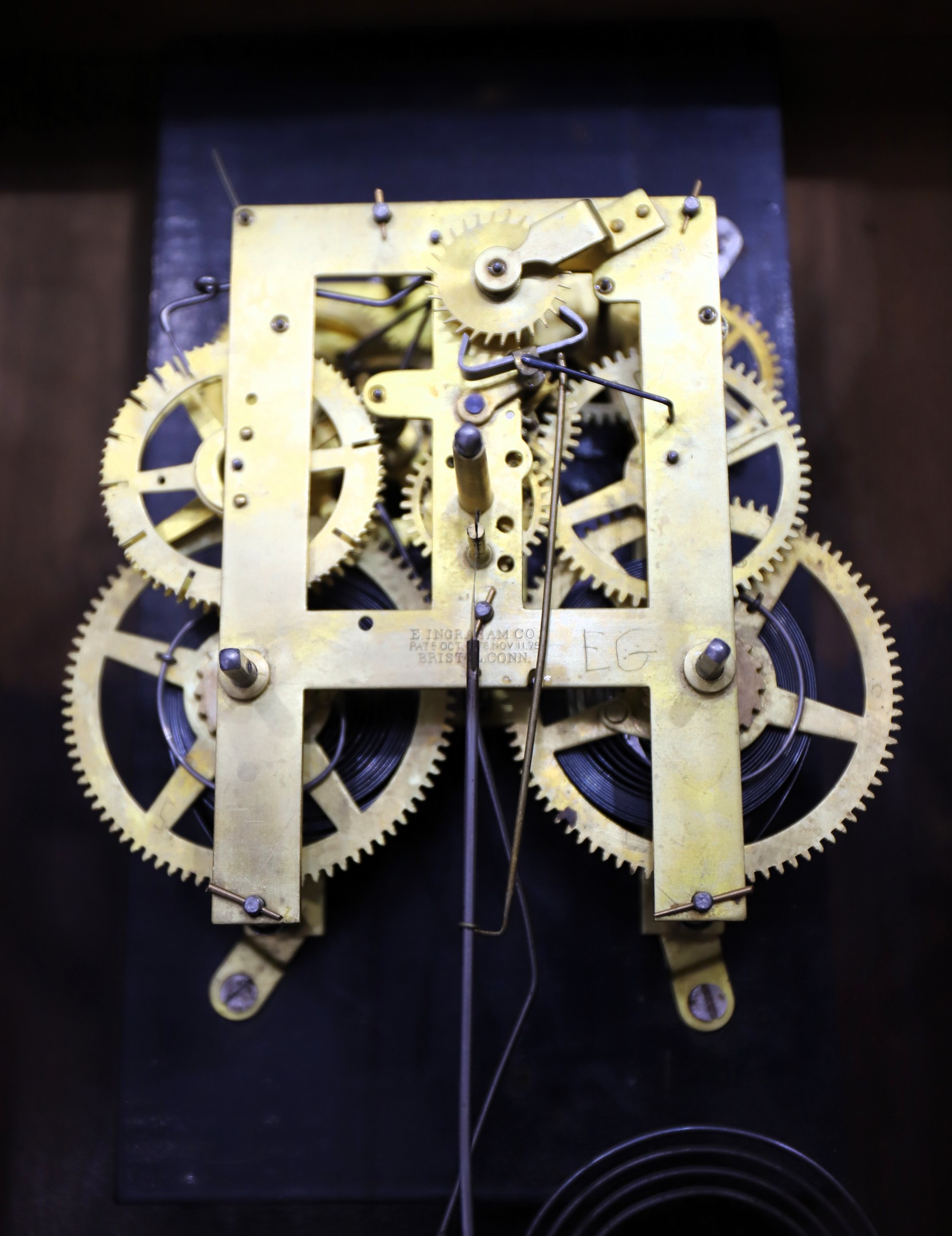 movement is signed and running, regulated by an Ingraham large pendulum bob with a brass rod cover and striking on a cathedral gong