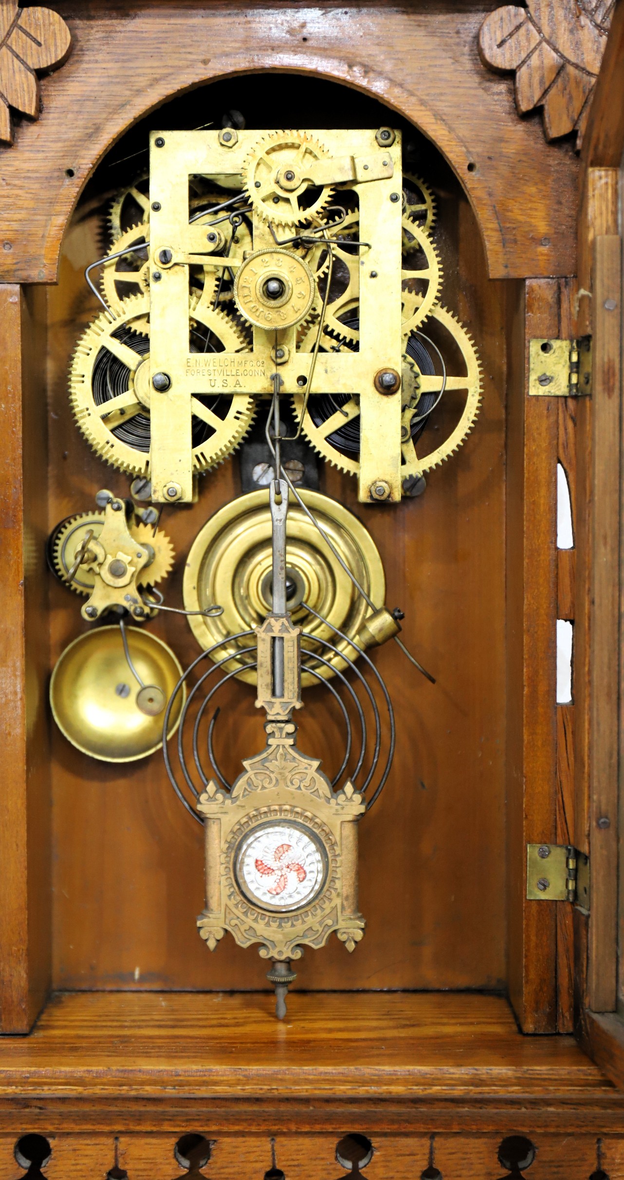 shown in Ly’s book on Welch clocks but the clock shown here has a different crest and base ornamentation. The oak case is 28