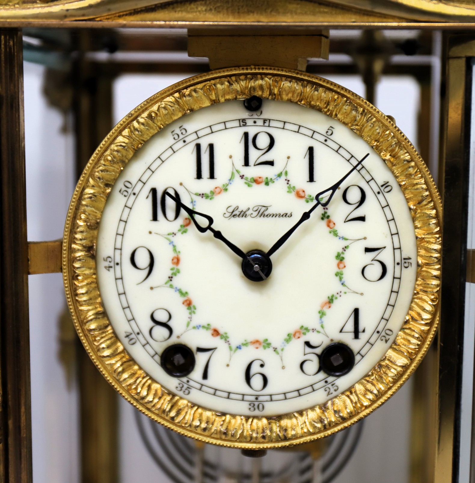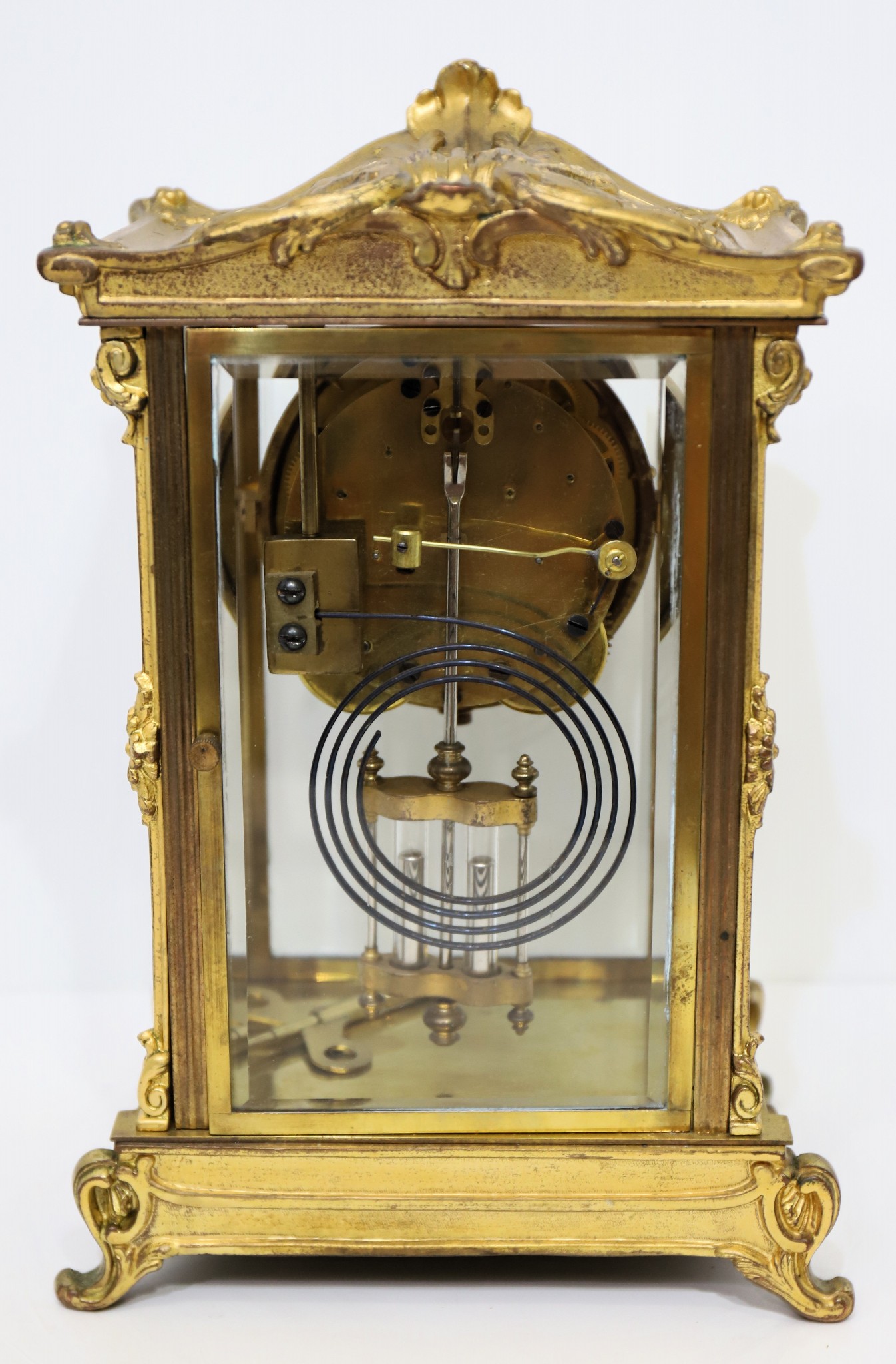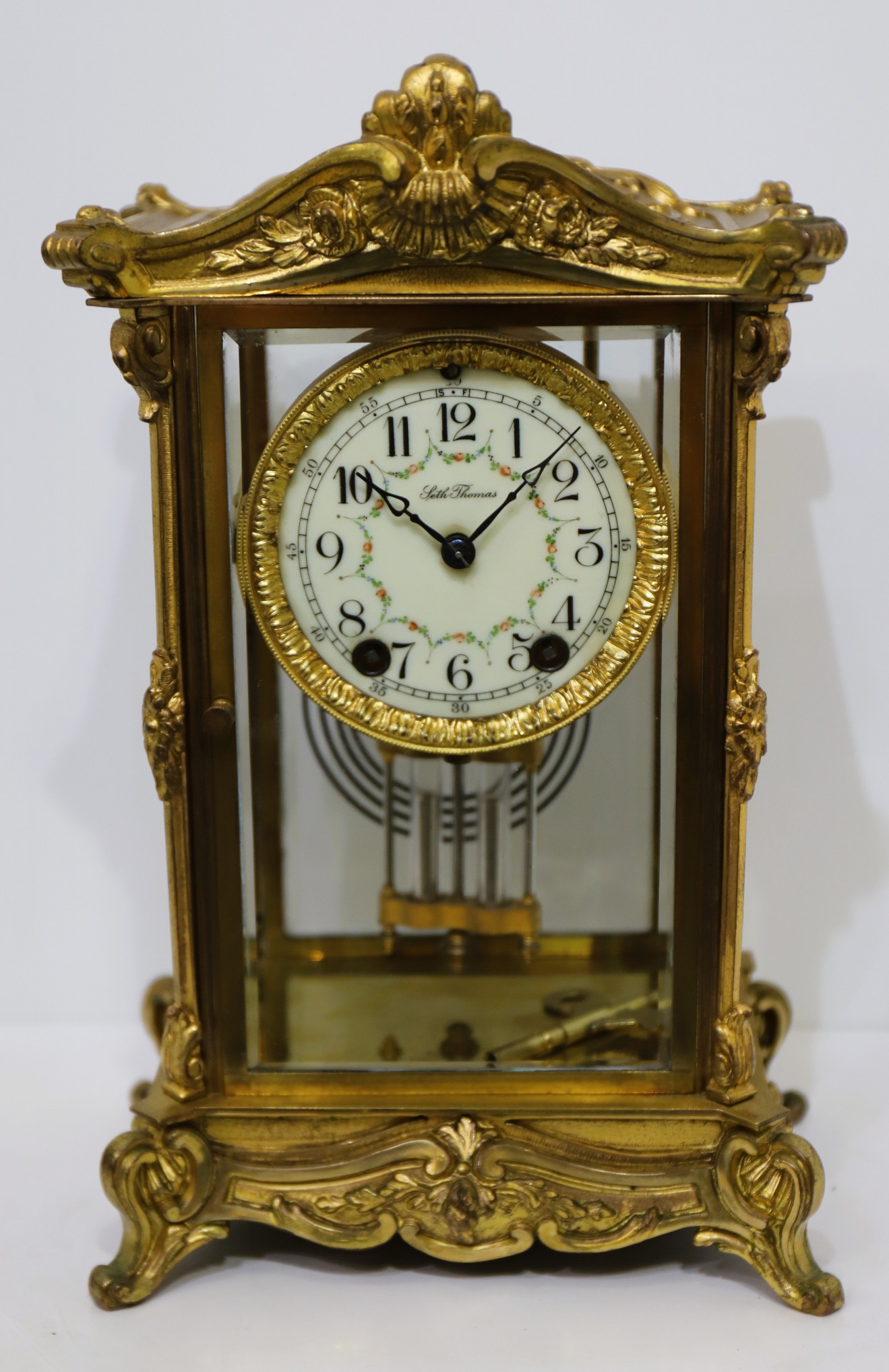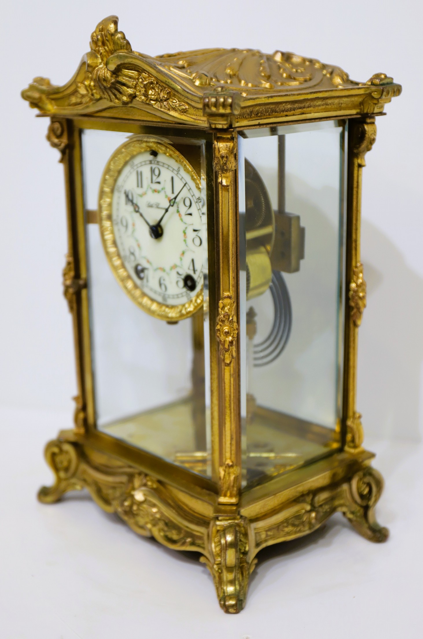 Seth Thomas Clock Co. “Empire No. 9” crystal regulator, 1907-1909. A 13-inch tall crystal regulator in brass with gilding, most of which still remains. There are four good beveled glasses and