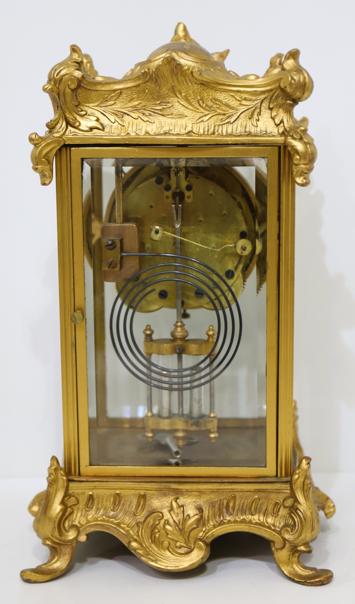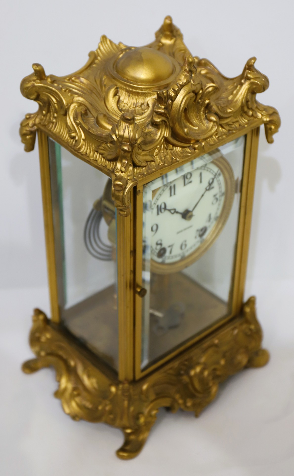 Seth Thomas Clock Co. “Empire No. 10” crystal regulator, ca. 1904. A 14-inch tall case with good gold color (probably repainted) and four beveled glasses. The flat porcelain dial is signed and