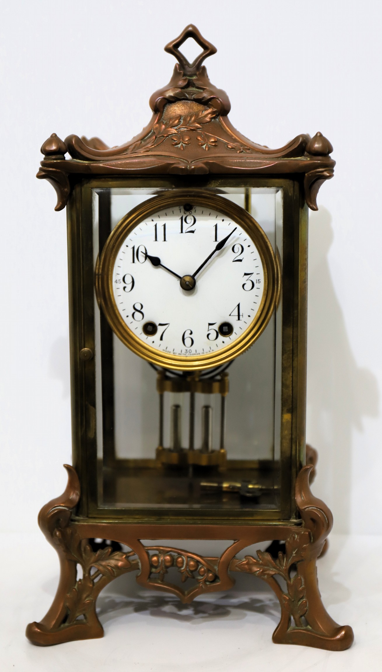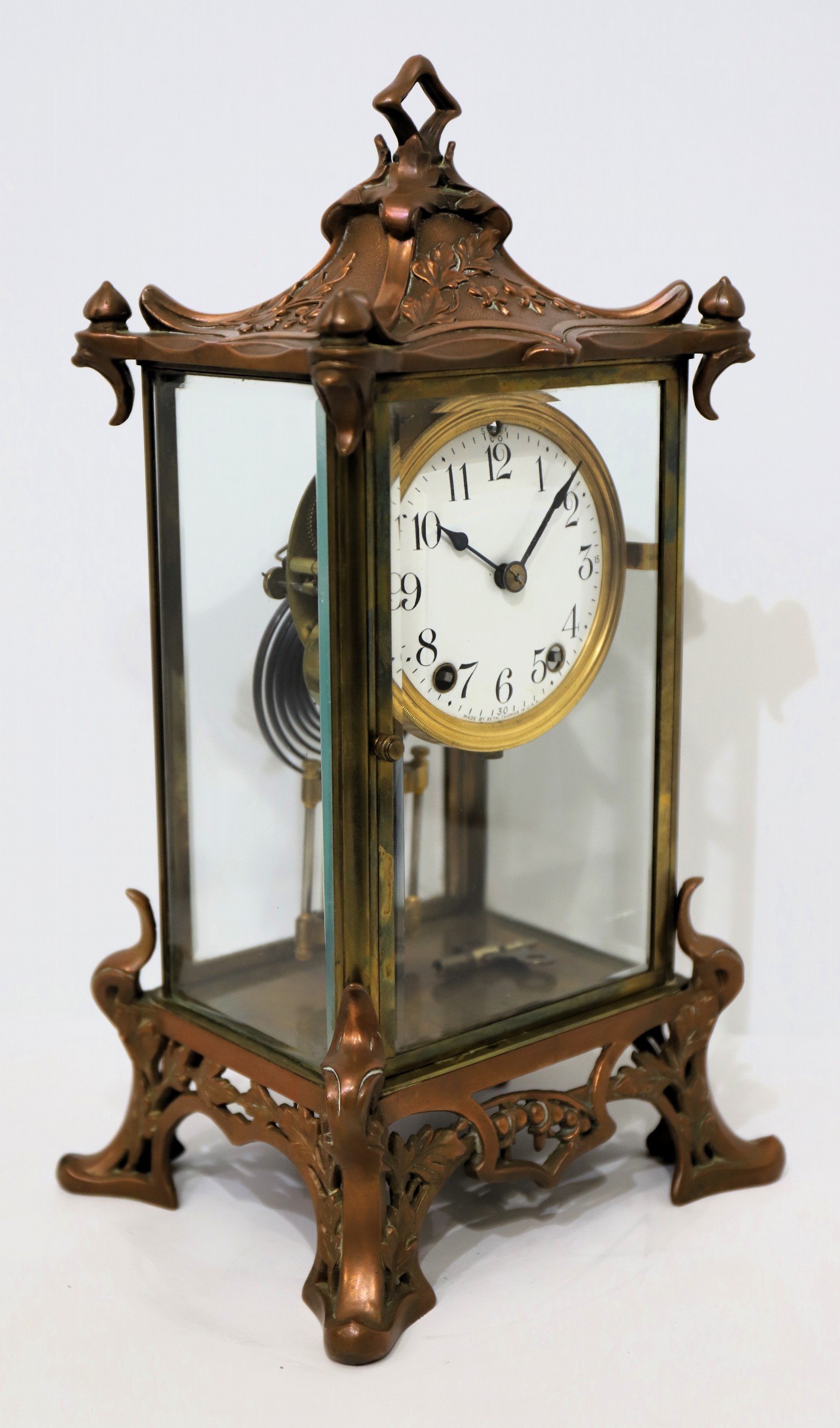 and it can look good. The four glasses are beveled, the dial is porcelain with replacement hands and a repaired minute hand. The 8-day time and half-hour strike movement bears the ST logo and is running and striking on the standing cathedral gong. AACsold one in 2024 for $225. It's an interesting and unusual model. $100-$200.
