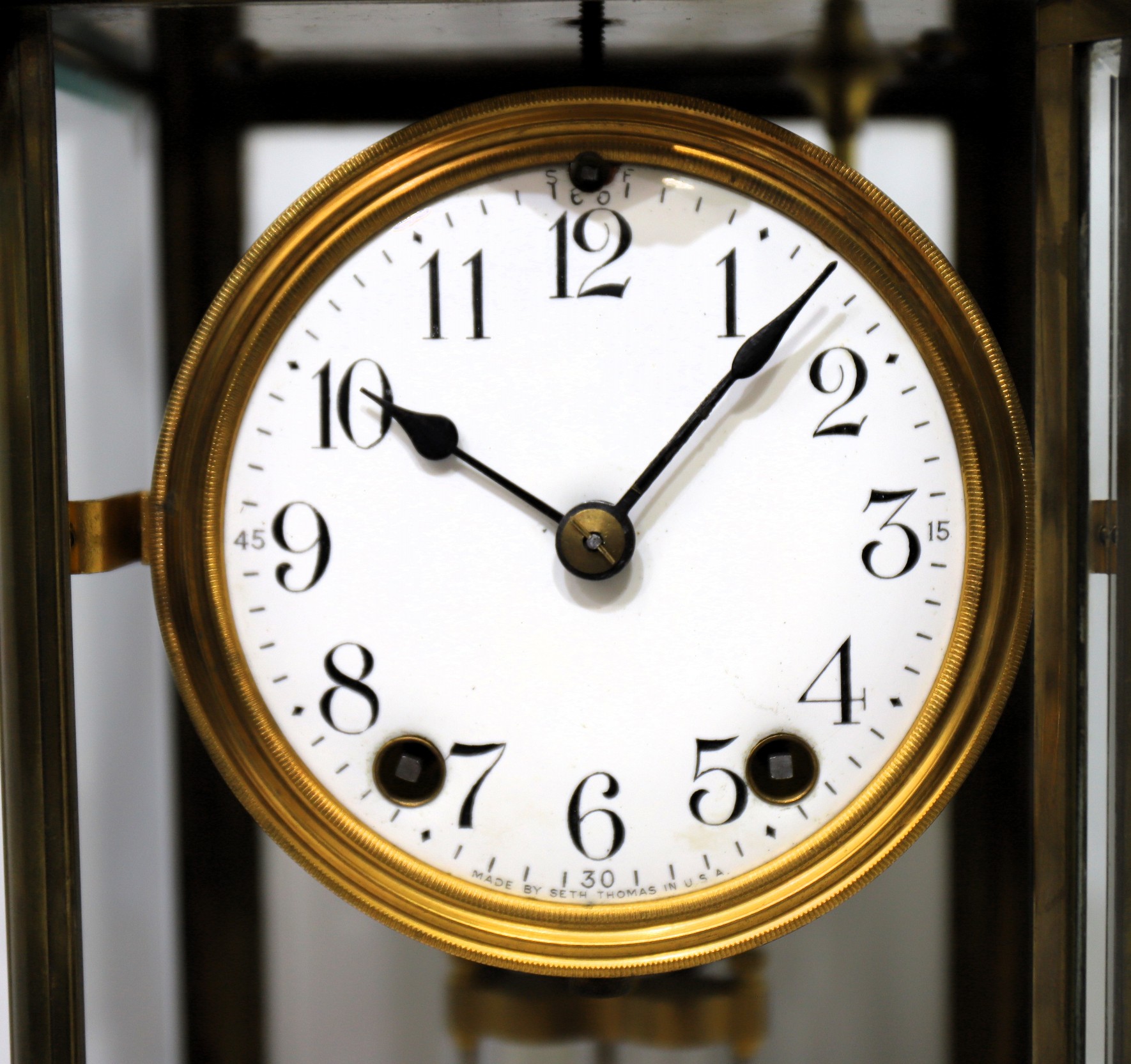 Seth Thomas Clock Co. “Empire No. 15” crystal regulator, 1909-1913. A 15-inch-tall clock with a coppery finish; this clock came in two finishes: Rich Gold or Bronze. I’m not sure which one this