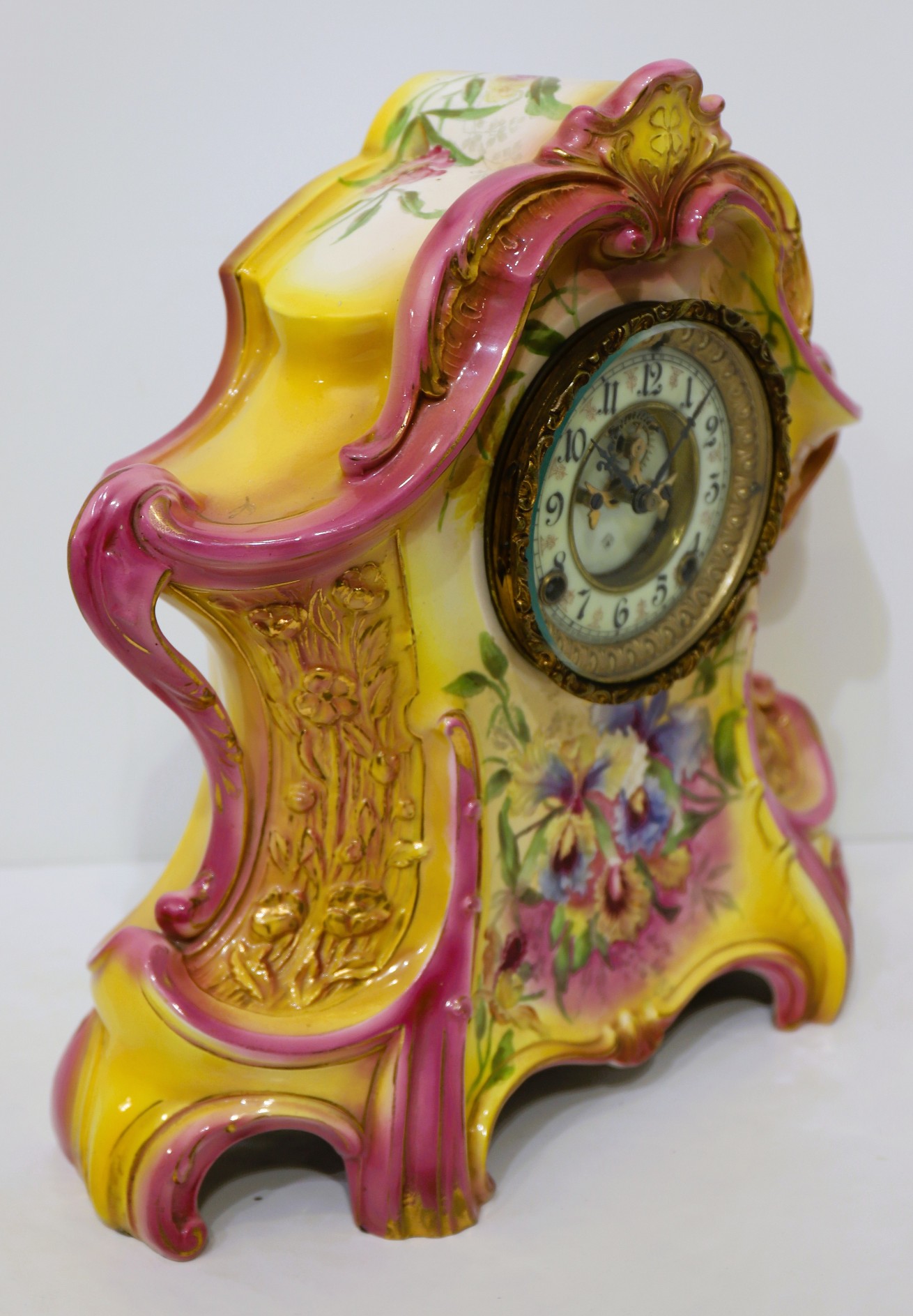 one in New Arts pink and yellow. Some losses to the gilding, but no chips or repairs; purple and blue irises on the front. There is a dark hairline crack to the back of the case. A beveled flat glass in the sash. The flawless and decorated