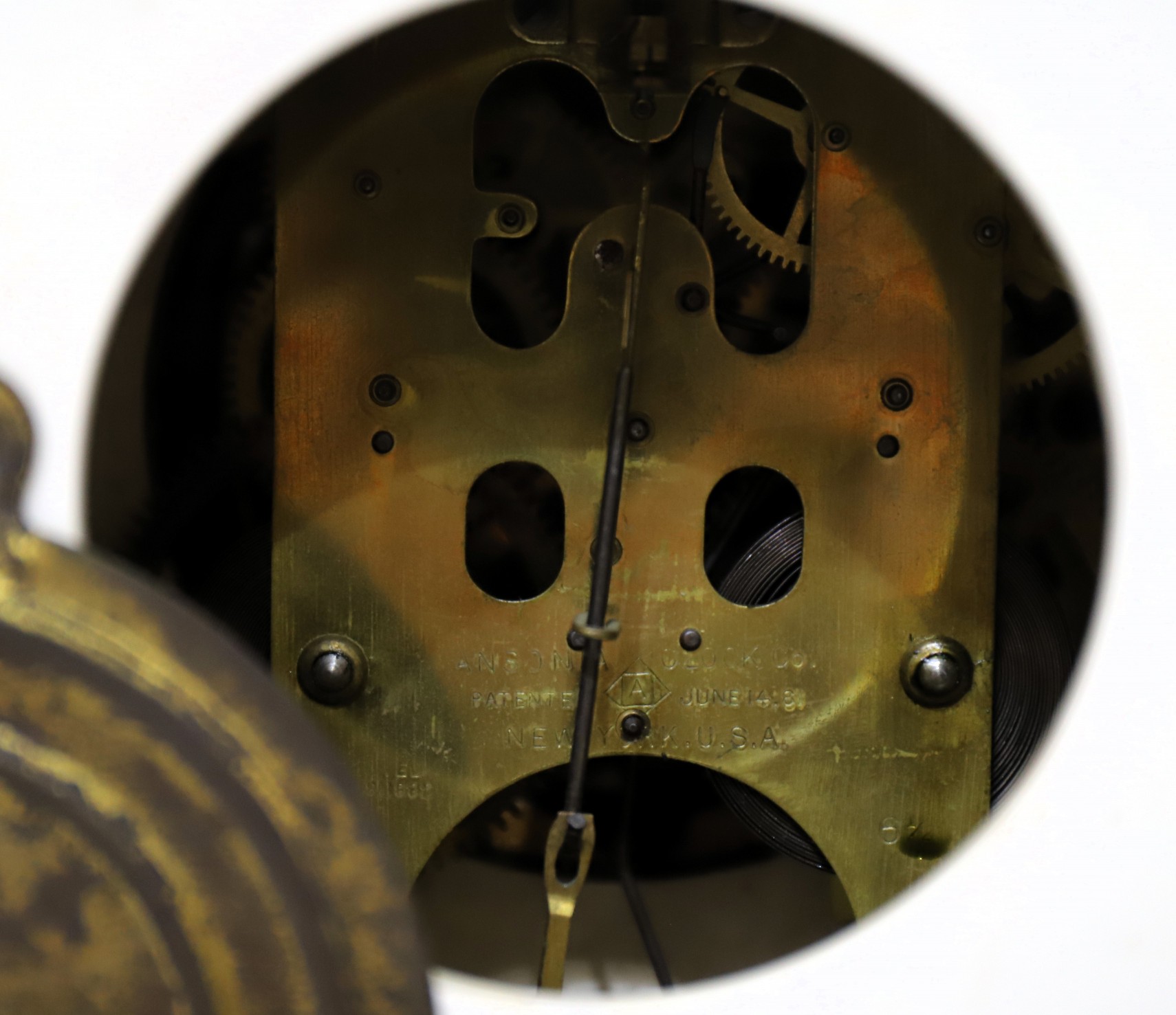 two-part porcelain dial is signed and the Ansonia logo is in the center dial, the visible escapement has steel pallets. The