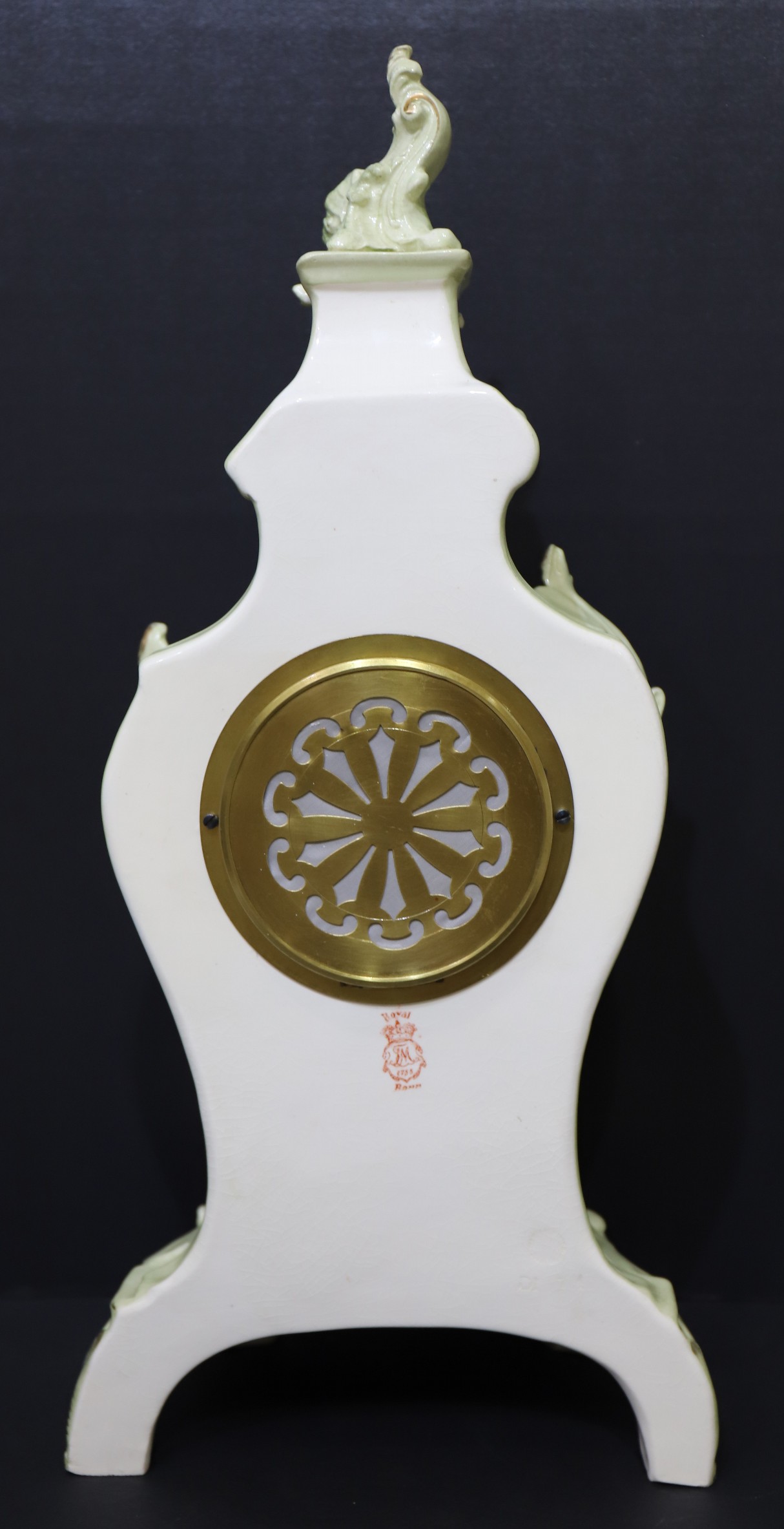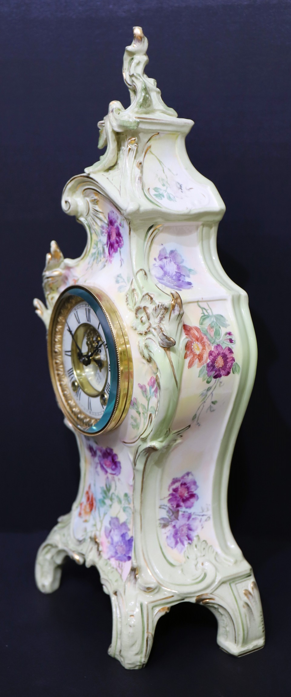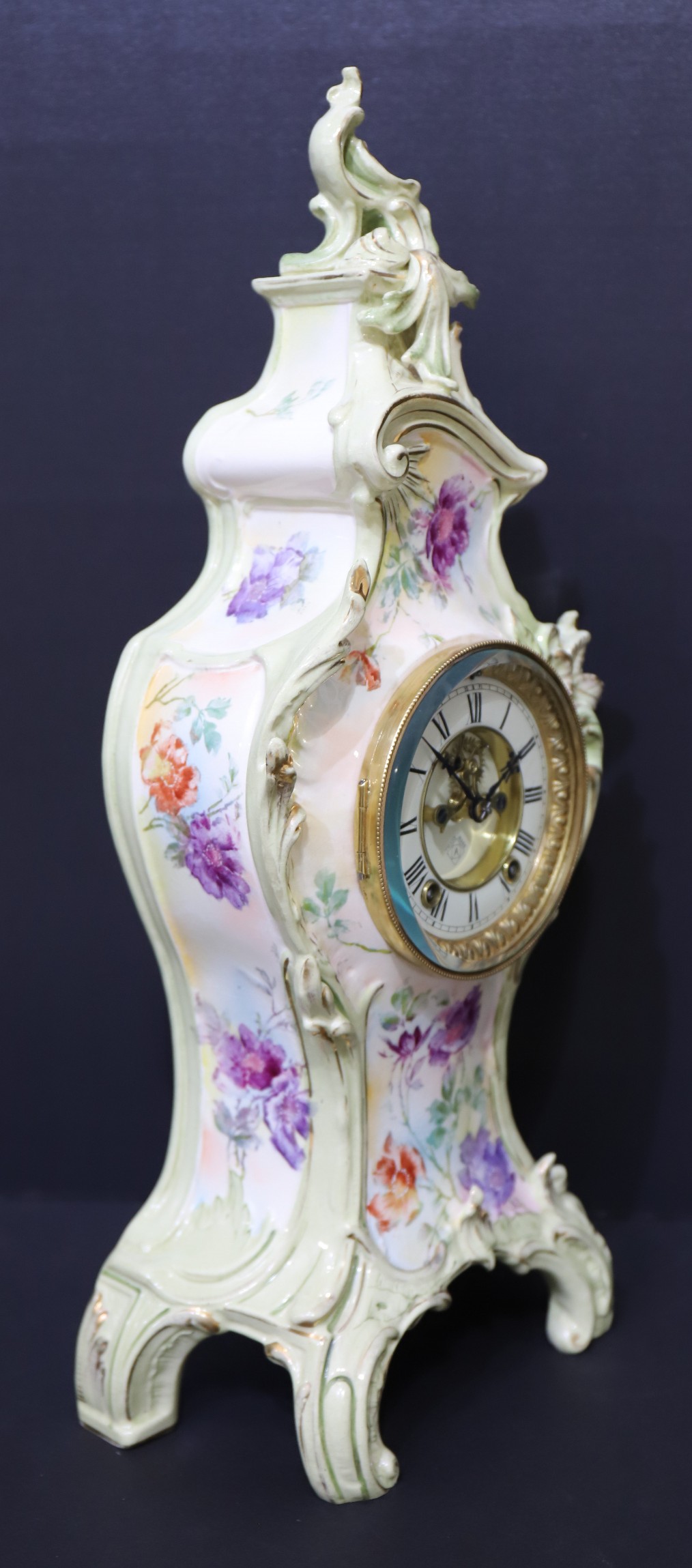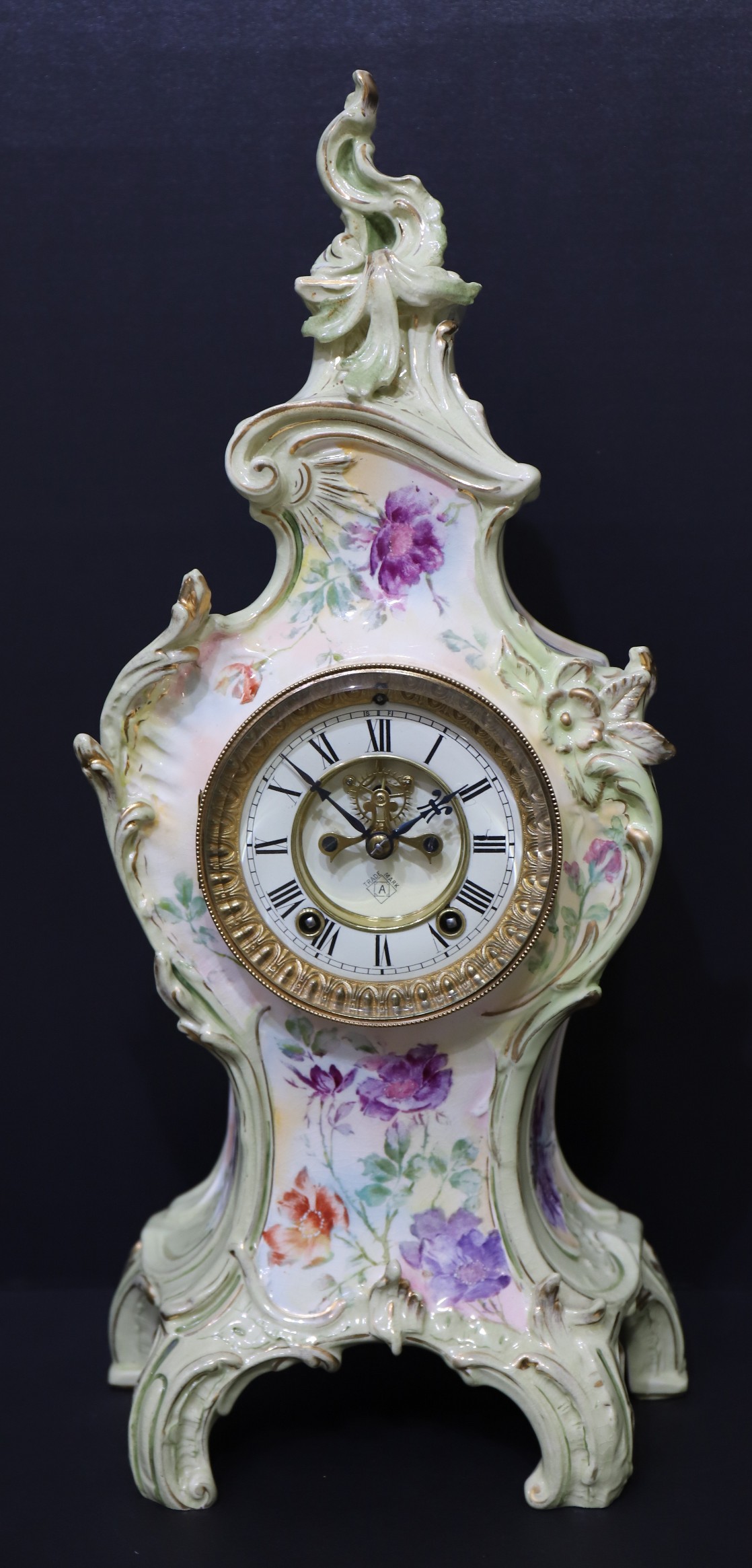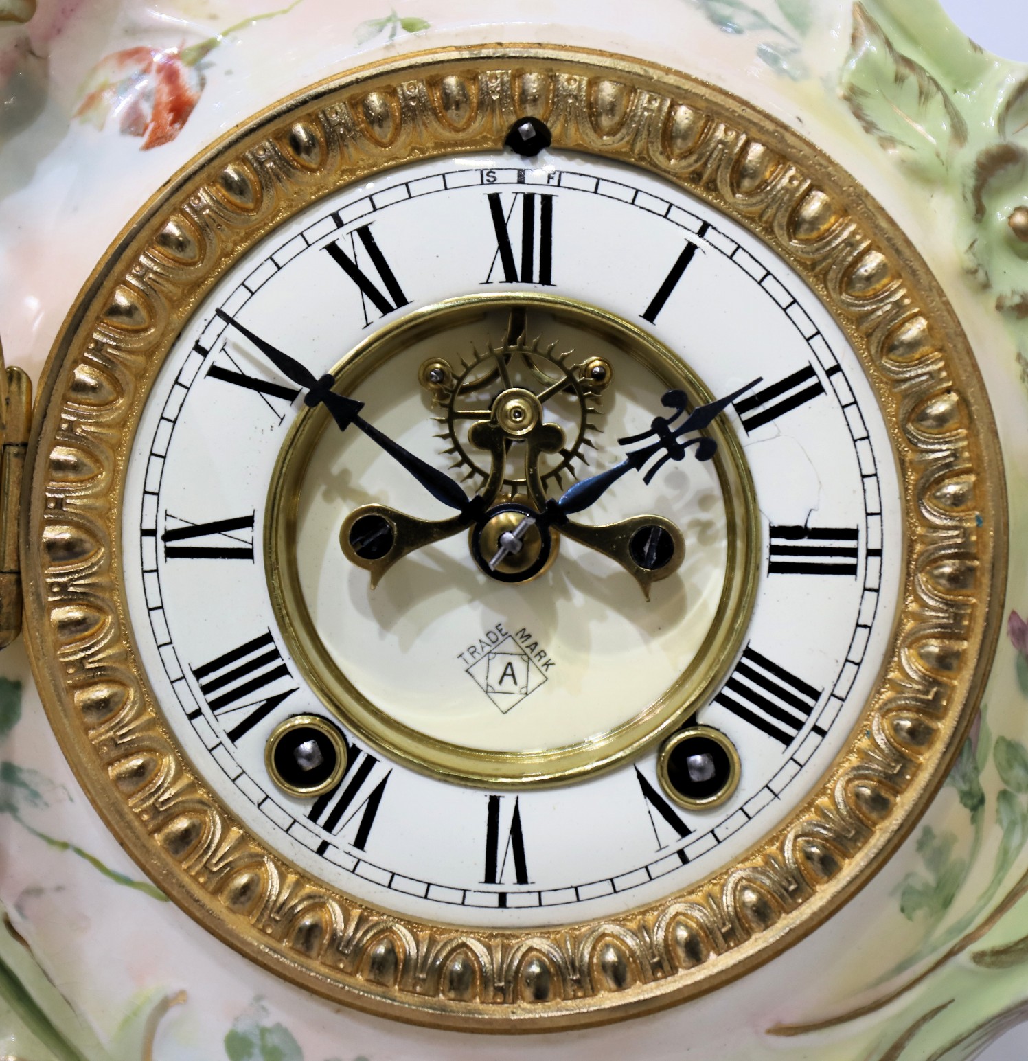 to find. The 21-inch green tint case with floral decorations shows no crazing and I see no cracks, chips, or repairs. The flat dial glass is beveled over a two-part porcelain dial that has some damage between the II and III. There is an Ansonia