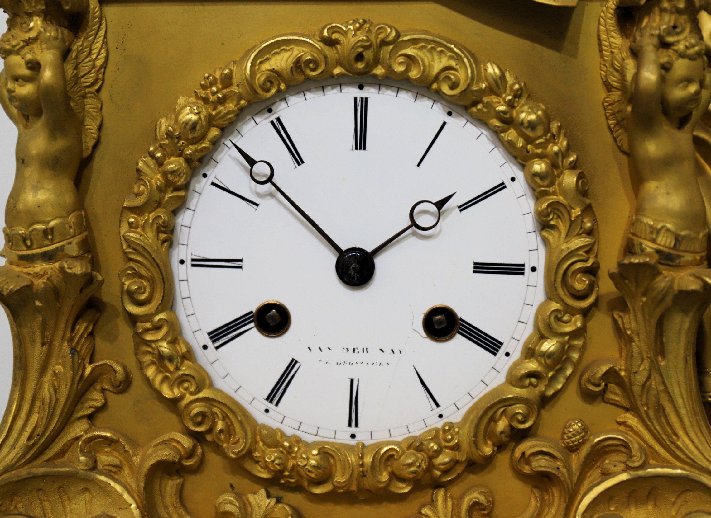 to be missing two upright pieces. There are two cherubs on either side of the clock dial, which is porcelain with some cracks