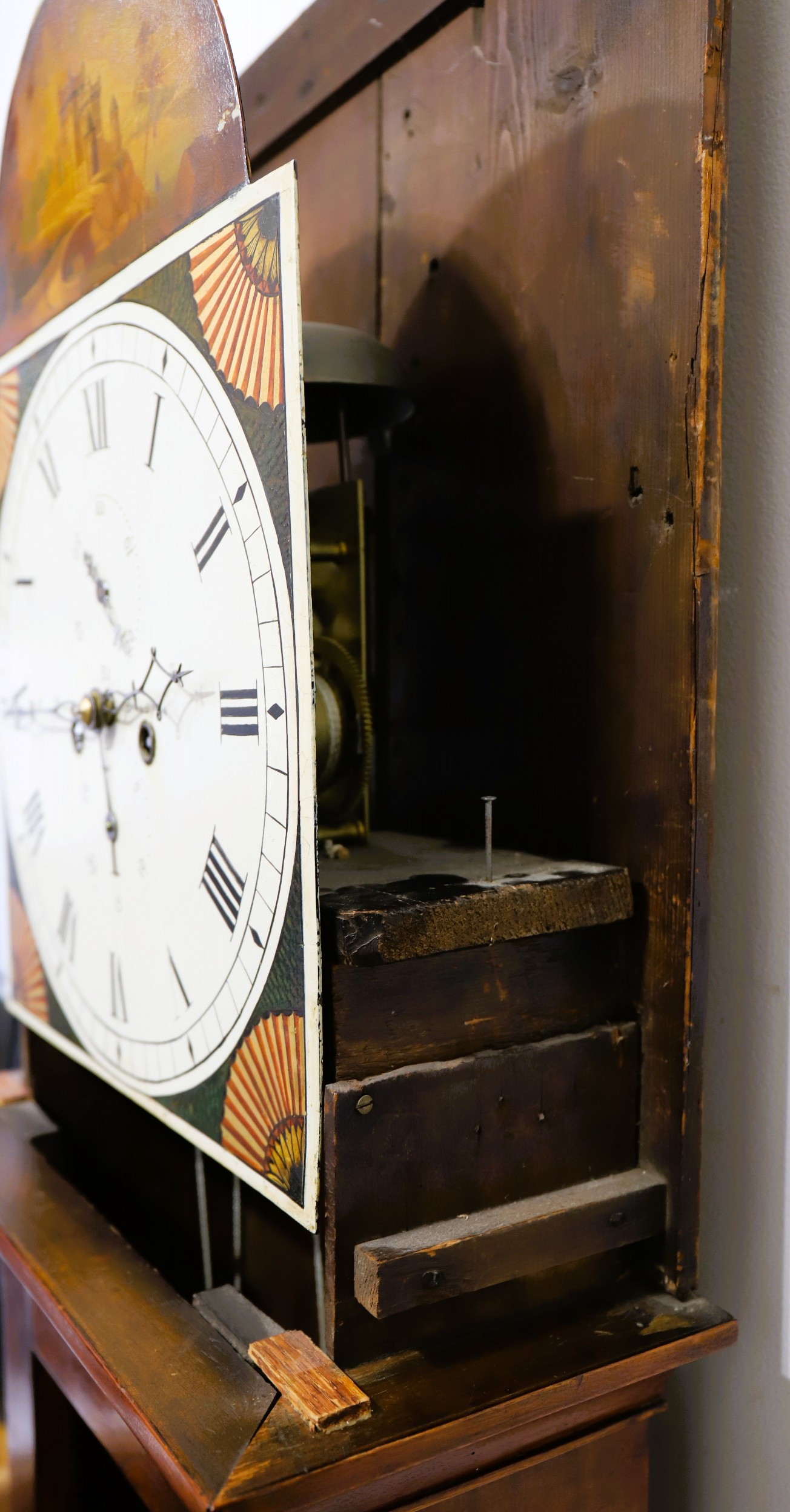 movement is unmarked, driven by two 12-lb iron weights and a restored pendulum. It is running strongly and striking on an overhead