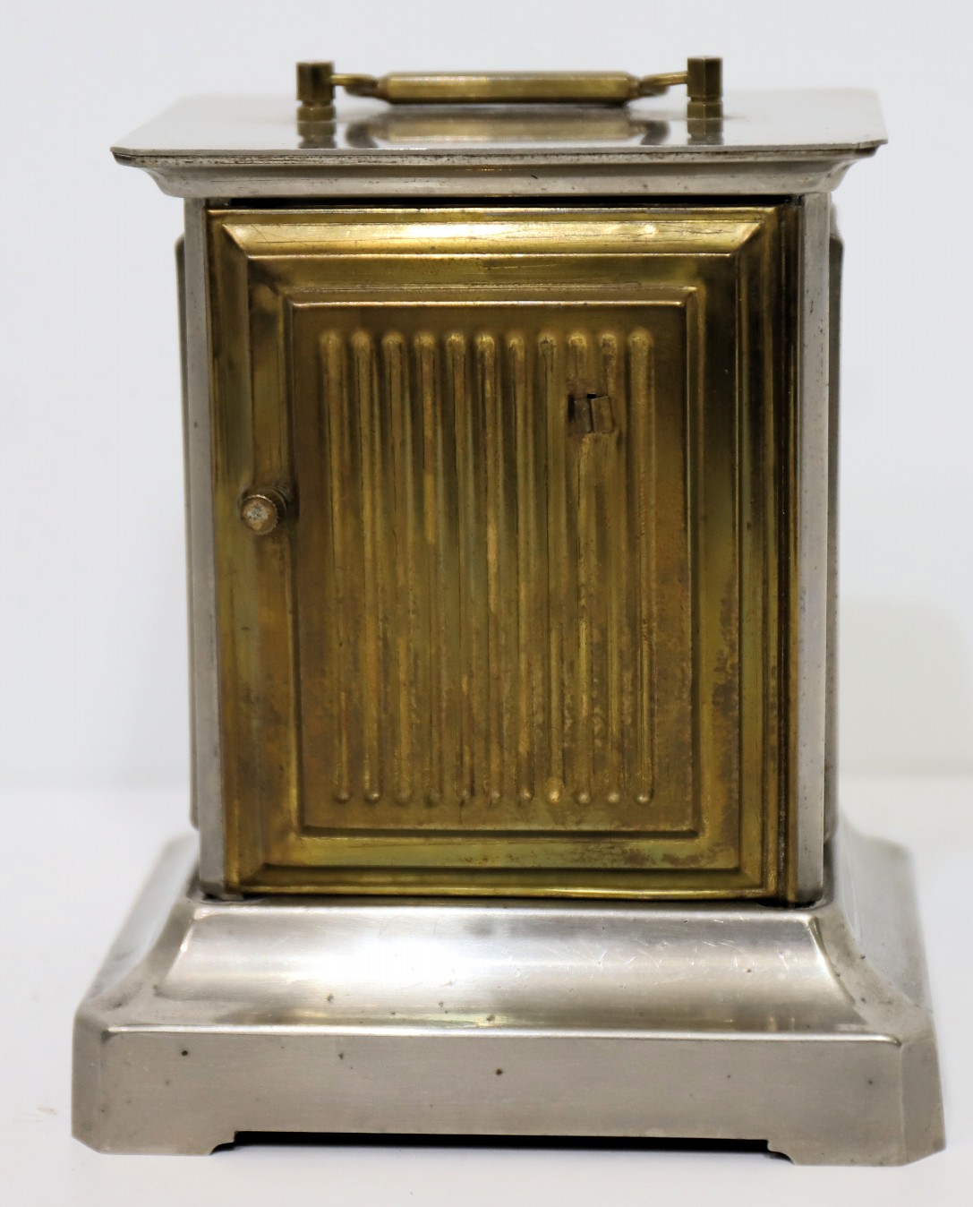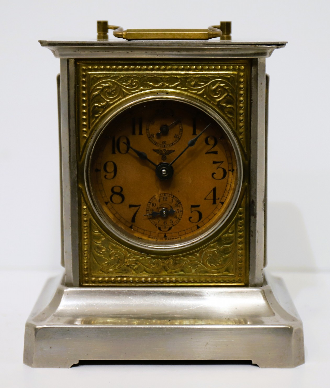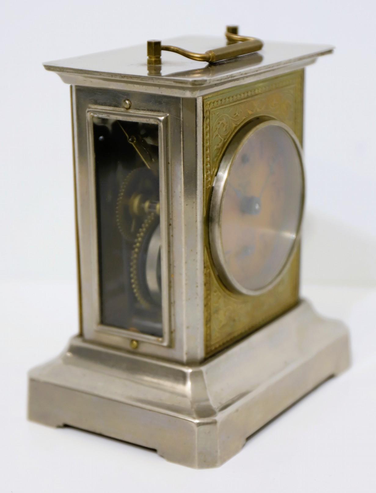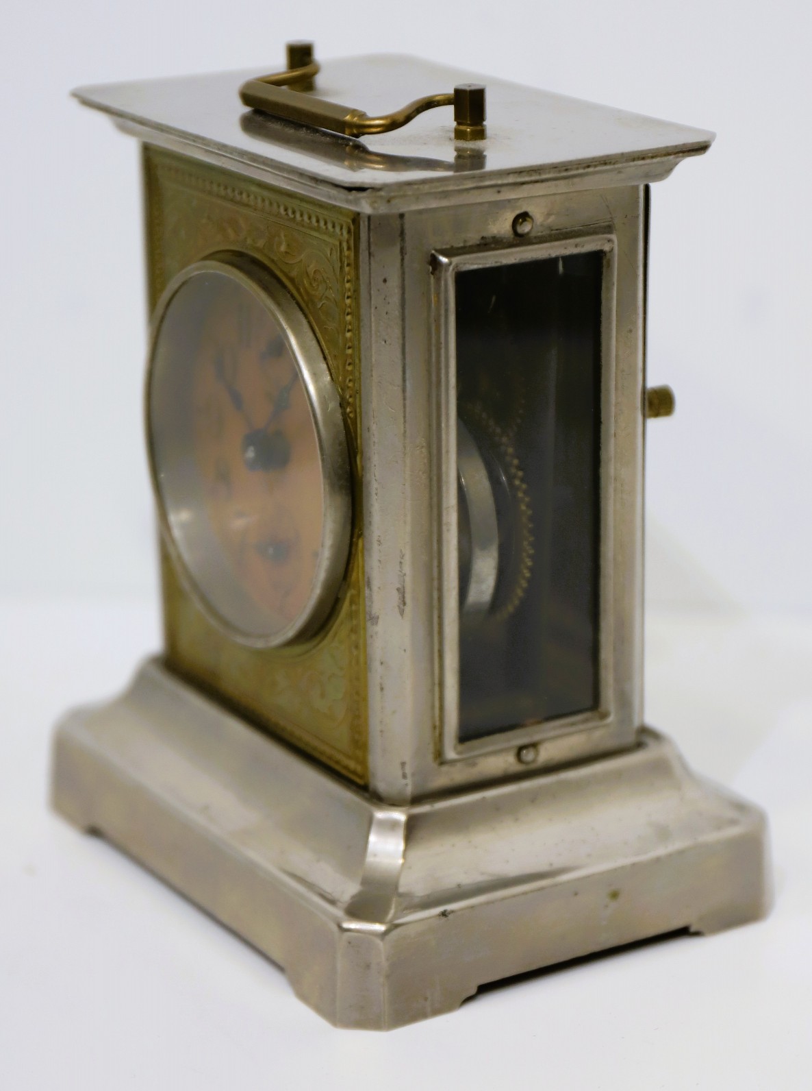 Mauthe musical alarm clock, ca. 1920. A 6-inch nickel and