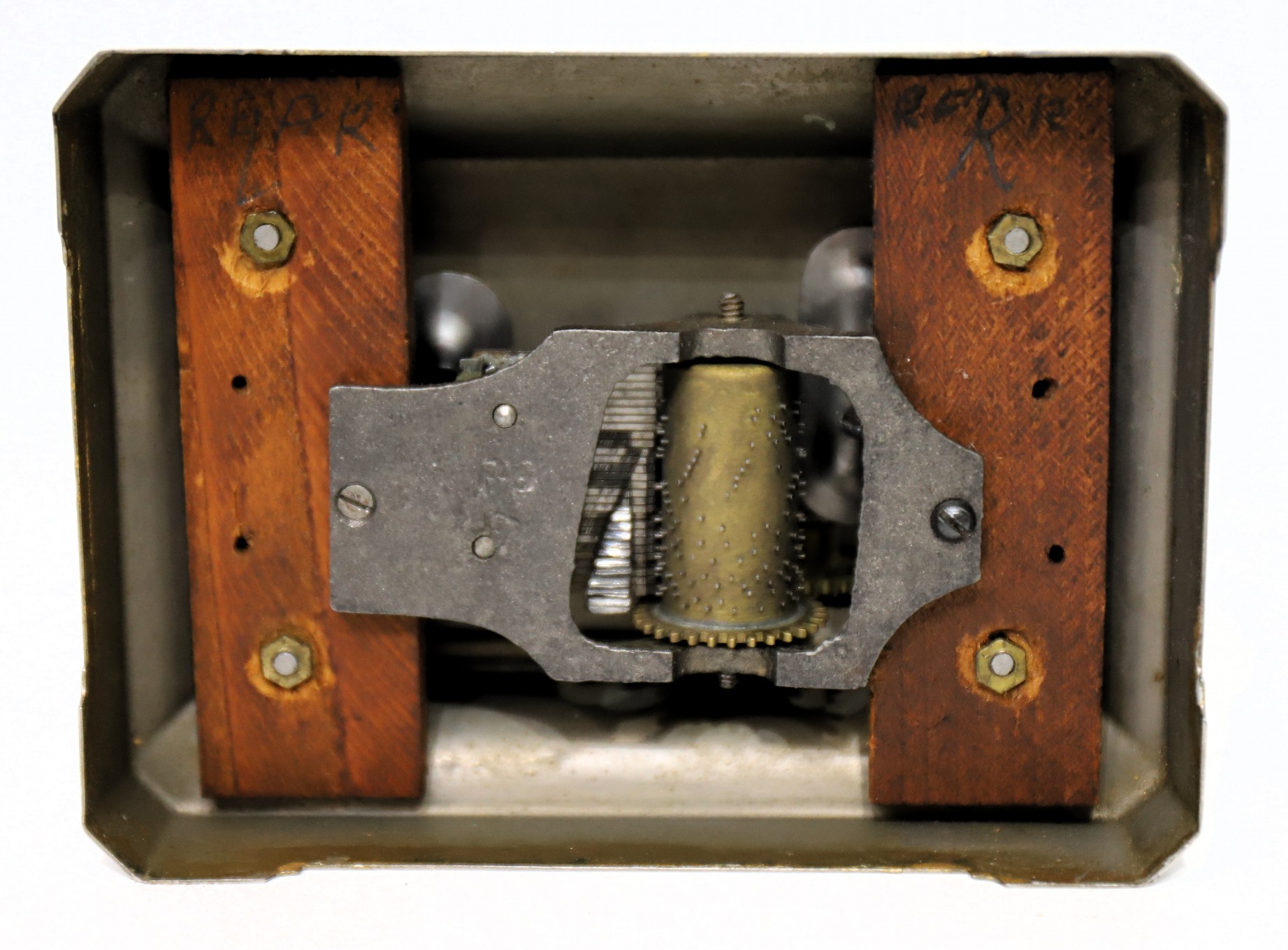 sets, and the music box on the bottom winds and plays when the alarm time is reached. This is a lever-spring movement that