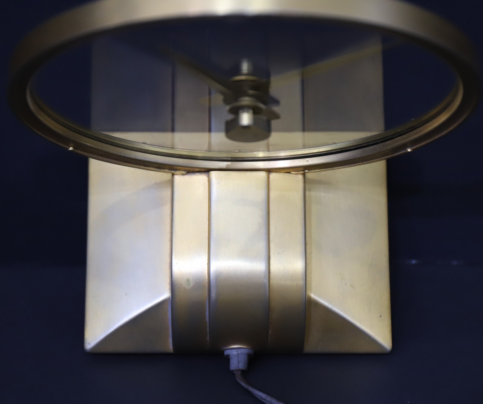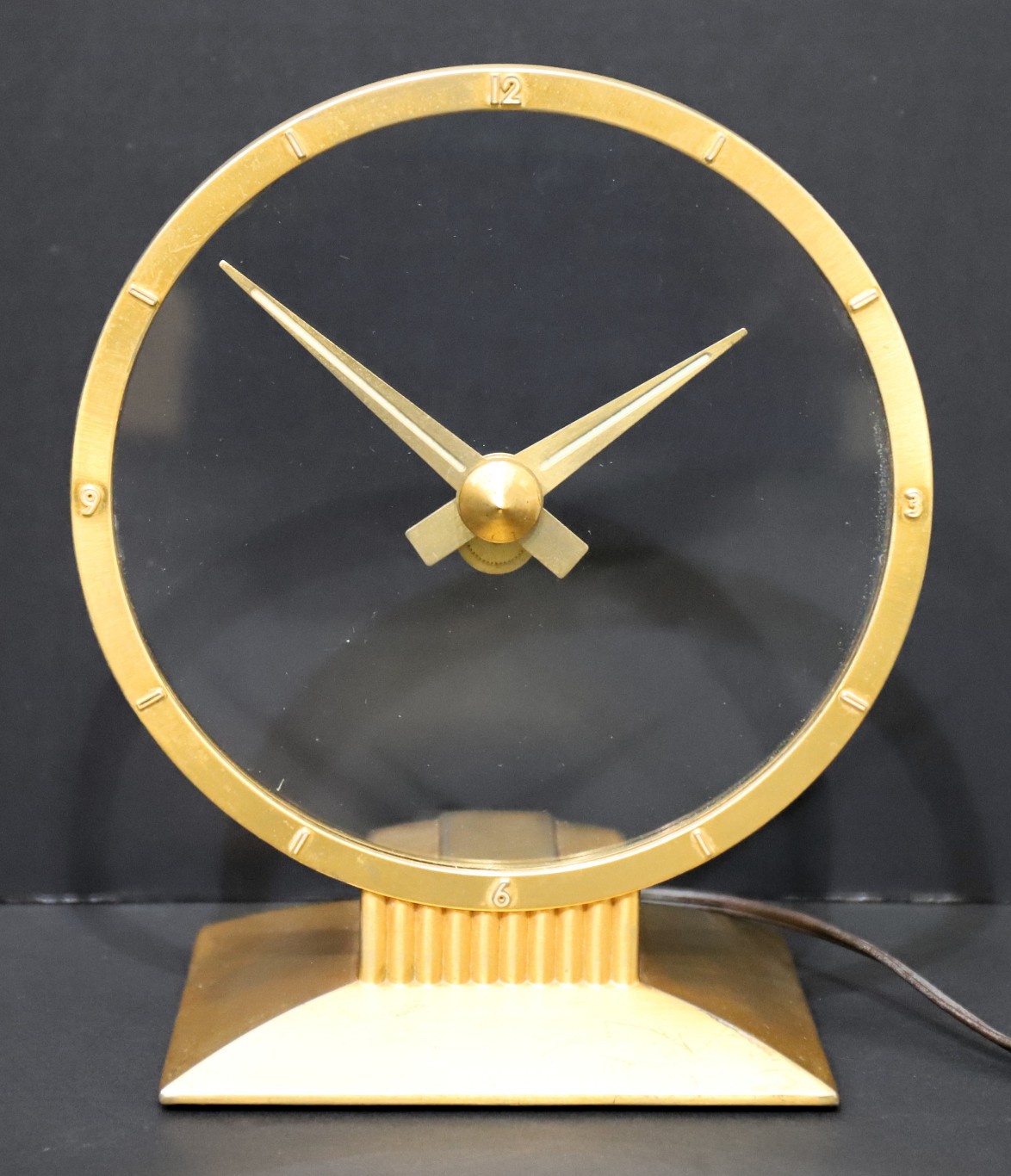 mystery clock, a 9-inch electric clock with a 7-inch glass dial. The gold finish on this example is worn, with some base metal