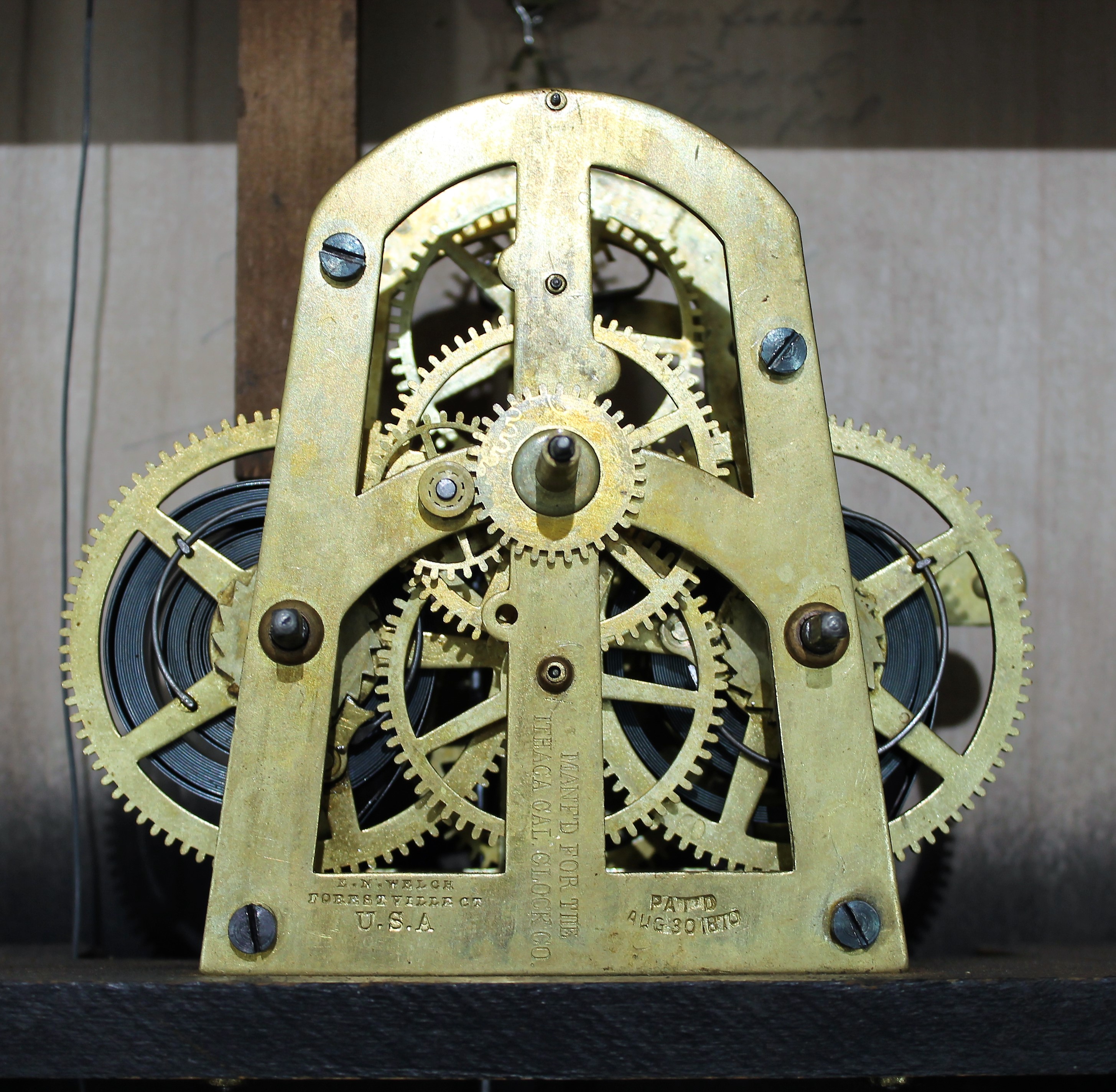 a 30-day double-wind movement made by Welch for the Ithaca Calendar Clock Co. as shown on page 130 of Ly’s Calendar Clocks. The calendar movement is also period/original. The clock is running, keeping time, and the calendar is advancing. These