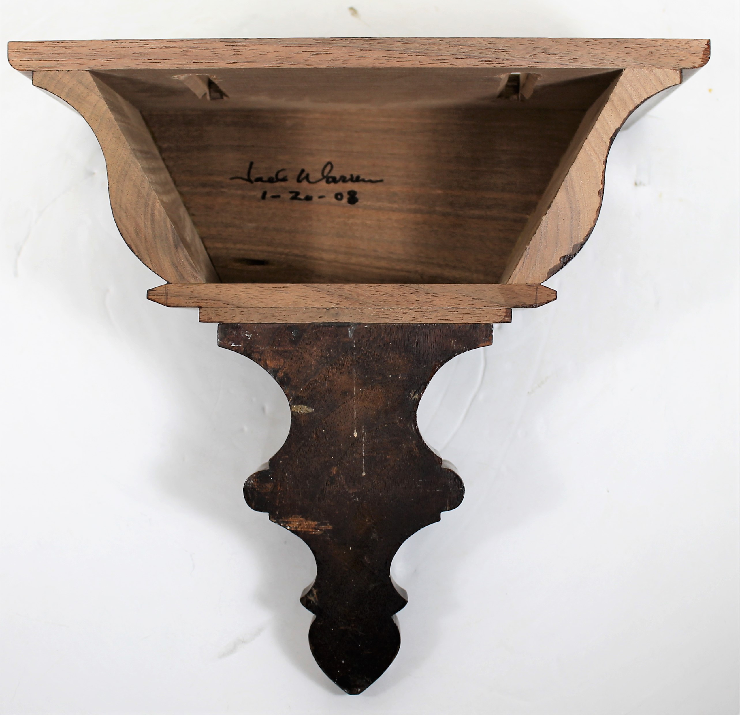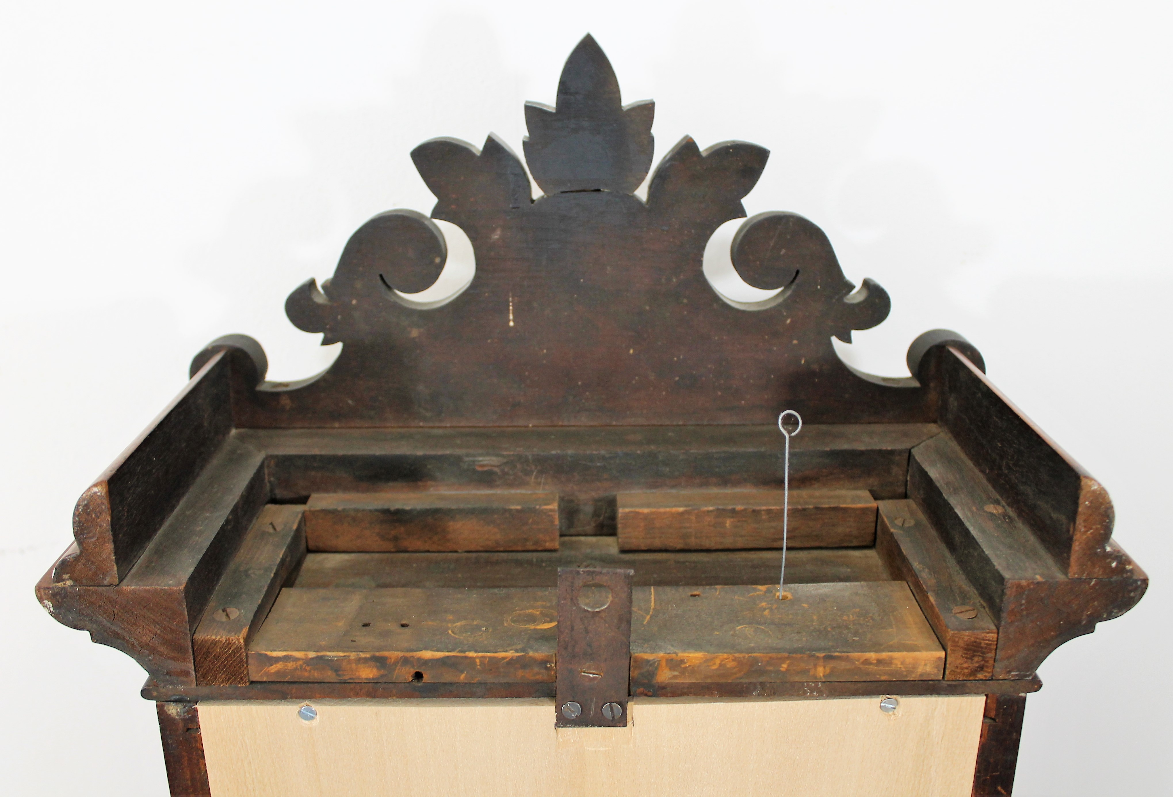condition, clean and polished, but not without patina. The burl walnut insets in the four corners of the door are quite nice. This clock has had significant restoration, including a new base, backboard, finials, and pendulum stick, all by Joel Warren. The crest is original but note that the centerpiece has been broken off and glued into place. The repair is not noticeable. The door glass is old but I wouldn’t bet that it is original. This is the early version of this model, with the pierced walnut