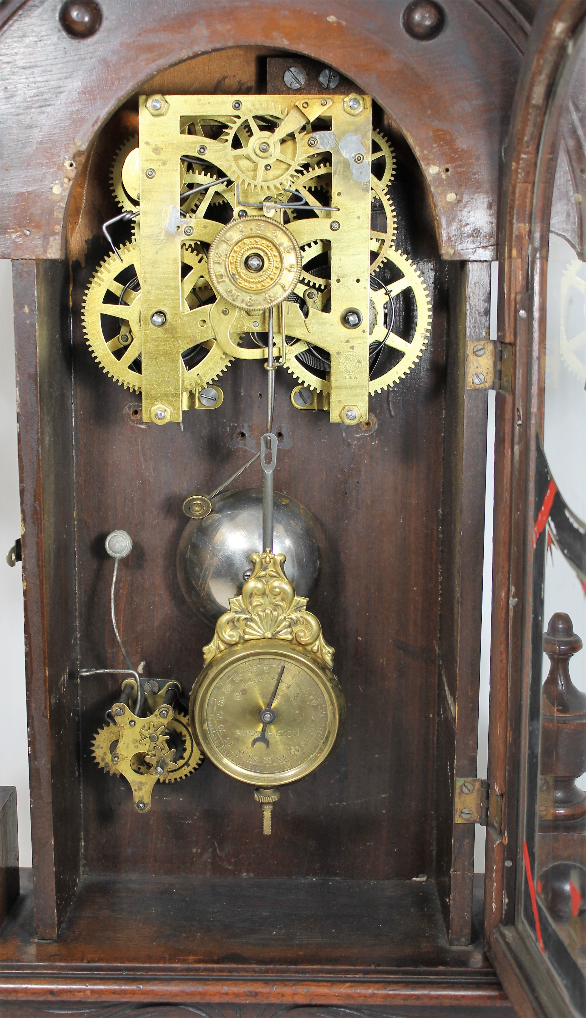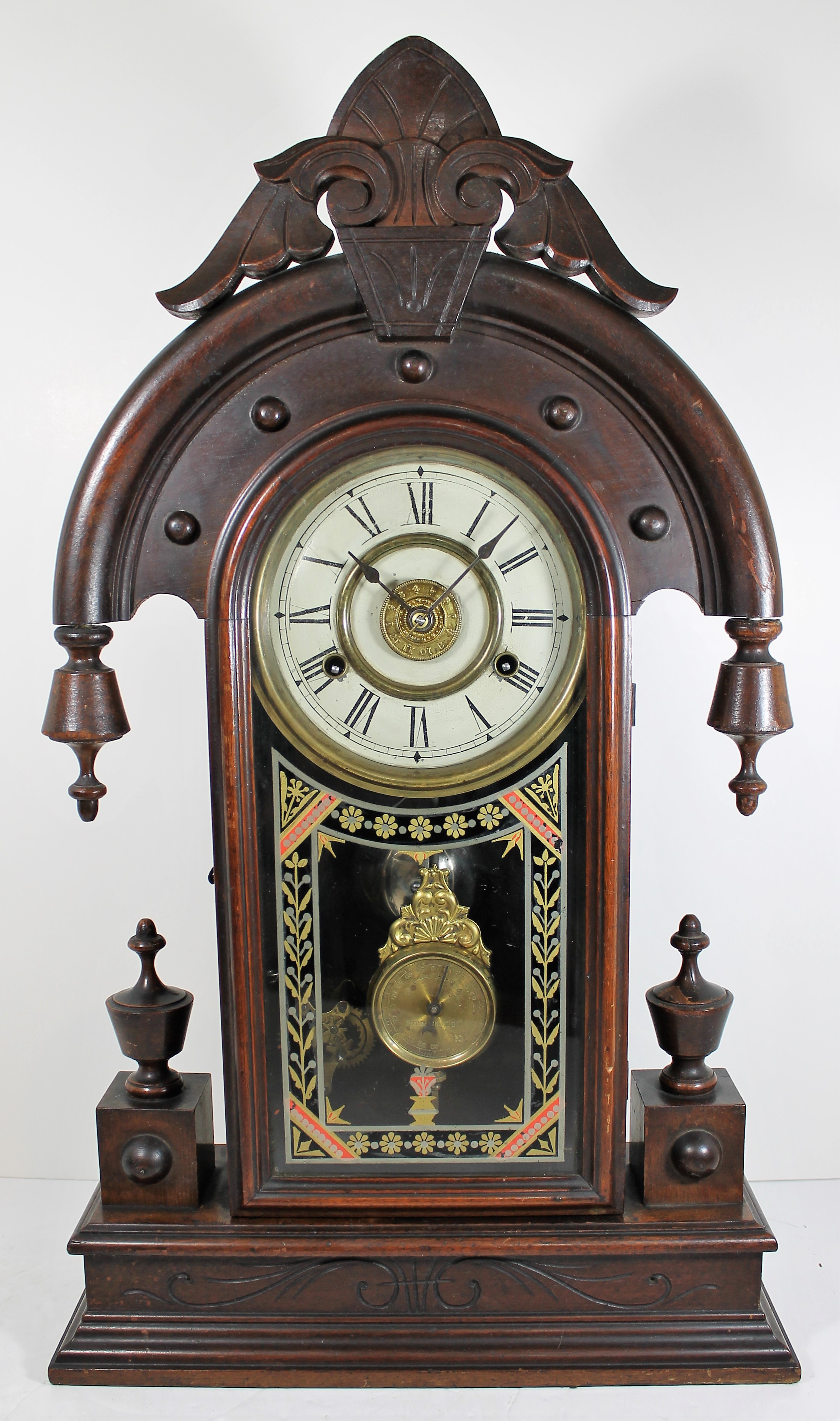 on New Haven clocks. A parlor-quality clock with a multicolor glass and a patented adjustable pendulum ball. The 24-inch