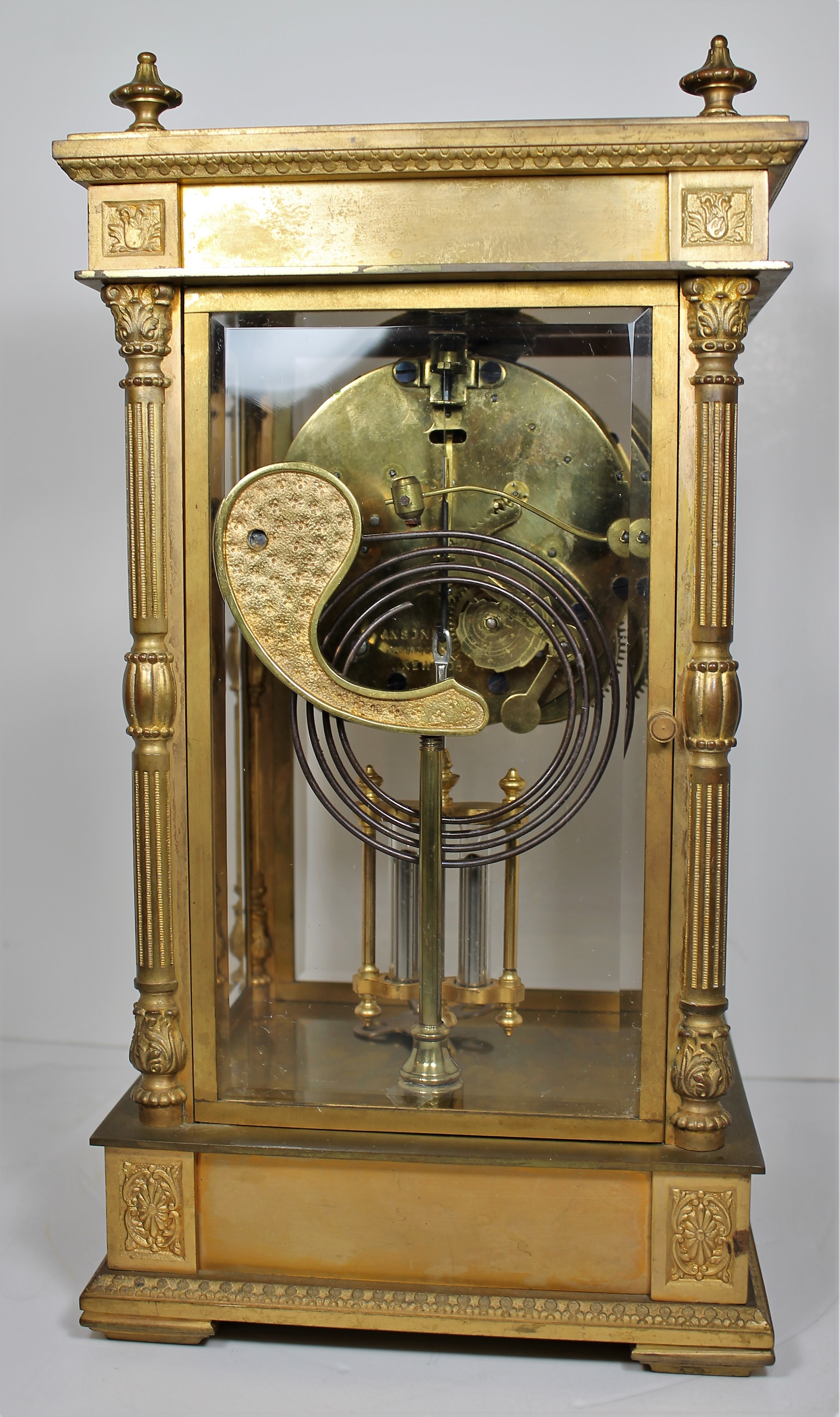 glasses and an 8-day, hour and half-hour gong strike with visible escapement and ruby pallets. The gilding is good in most places;