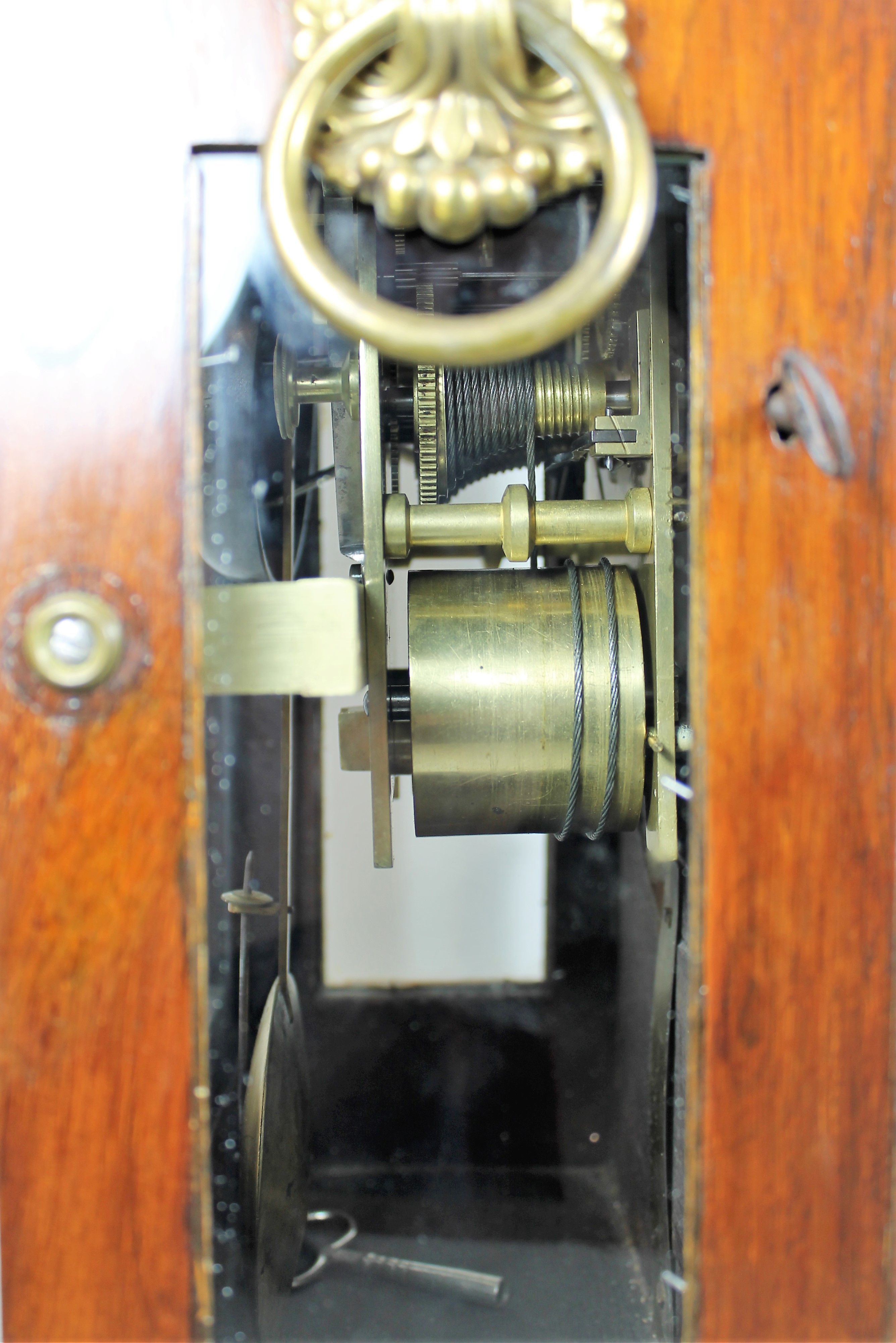 rear door to view the unsigned early 1800’s (note the movement pillars) brass double-fusee movement. There is a heavy pendulum