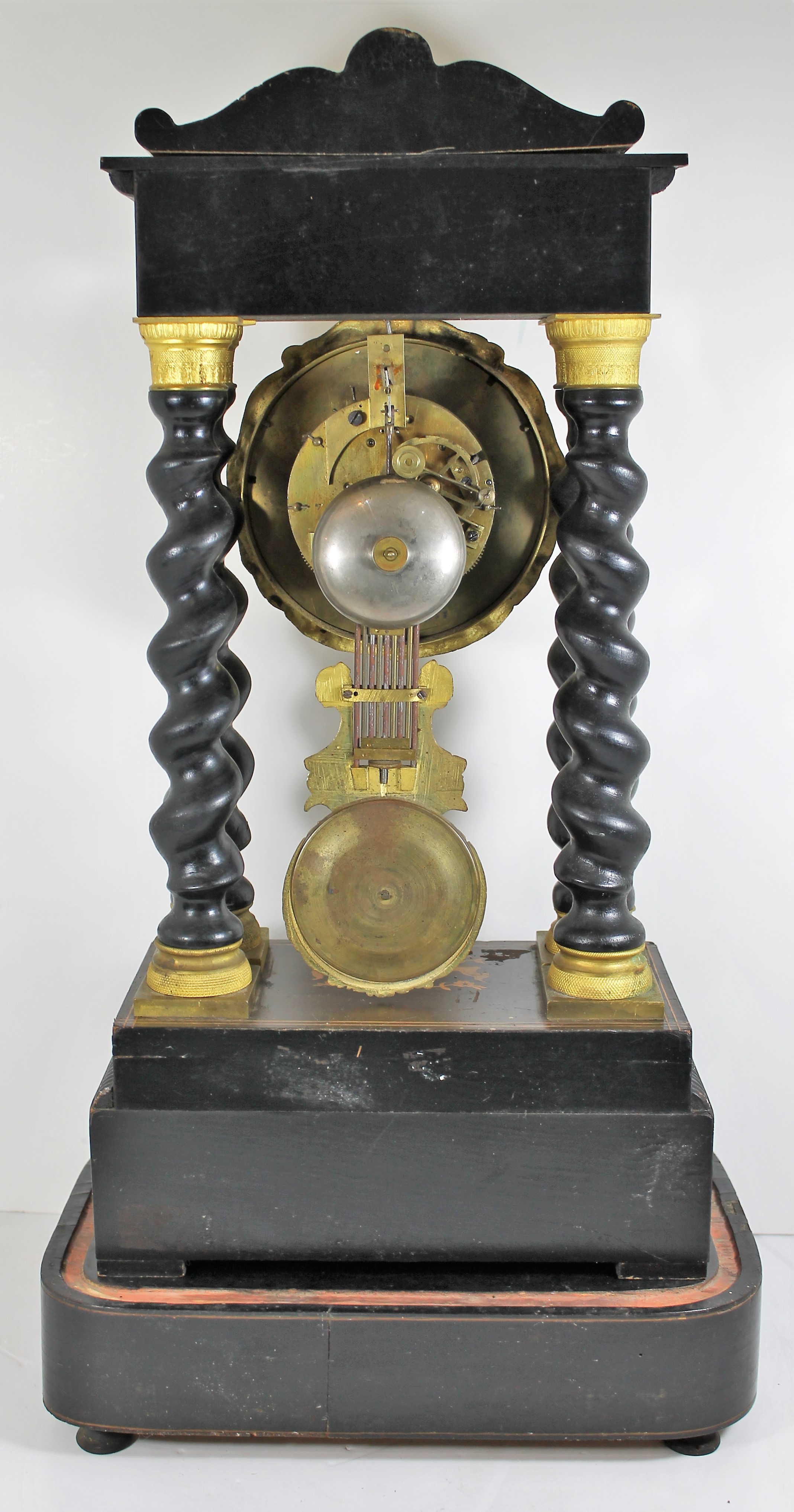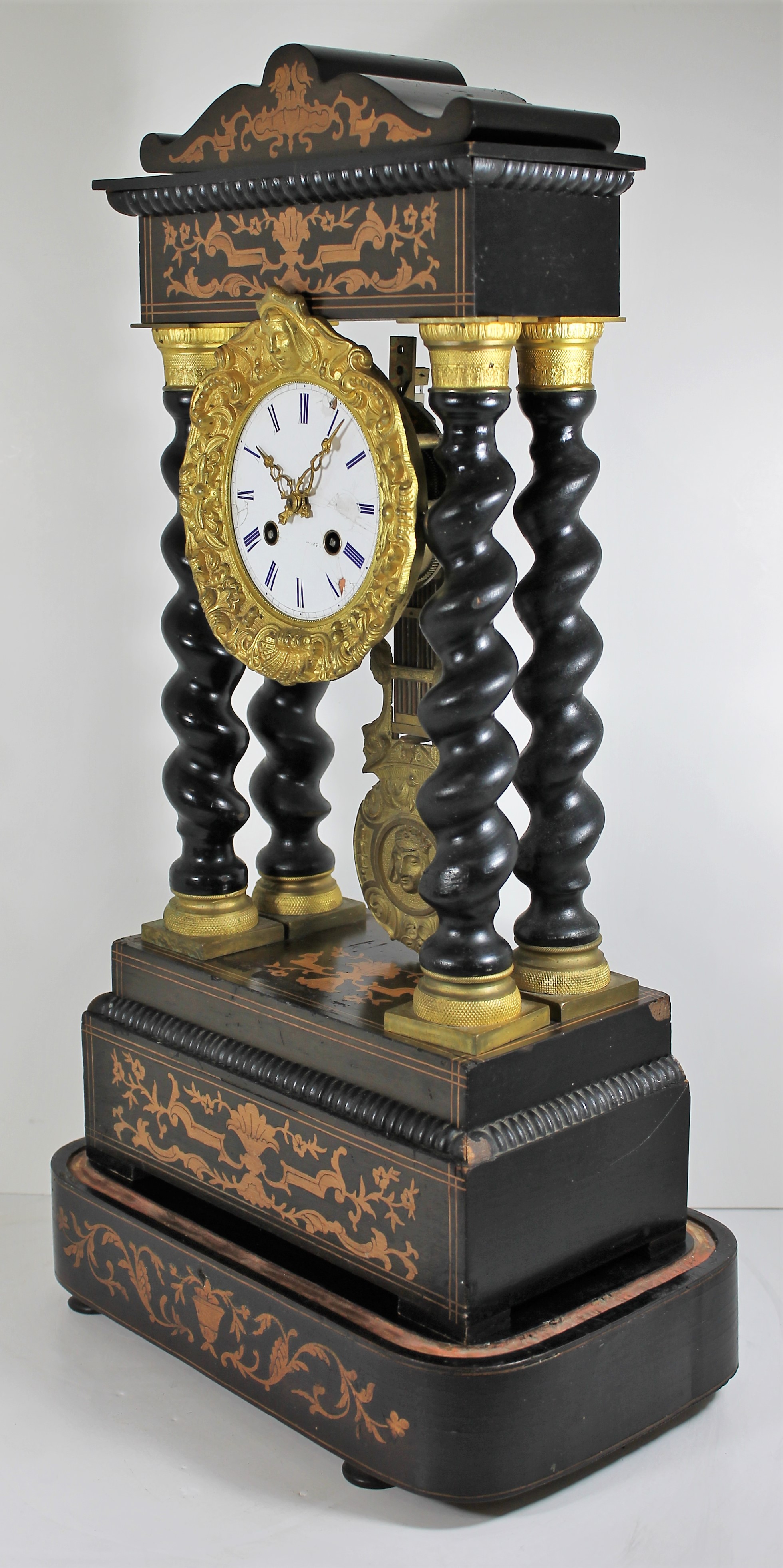 French wood portico, ca. 1880. A 19-inch portico clock in a mahogany case with satinwood inlays