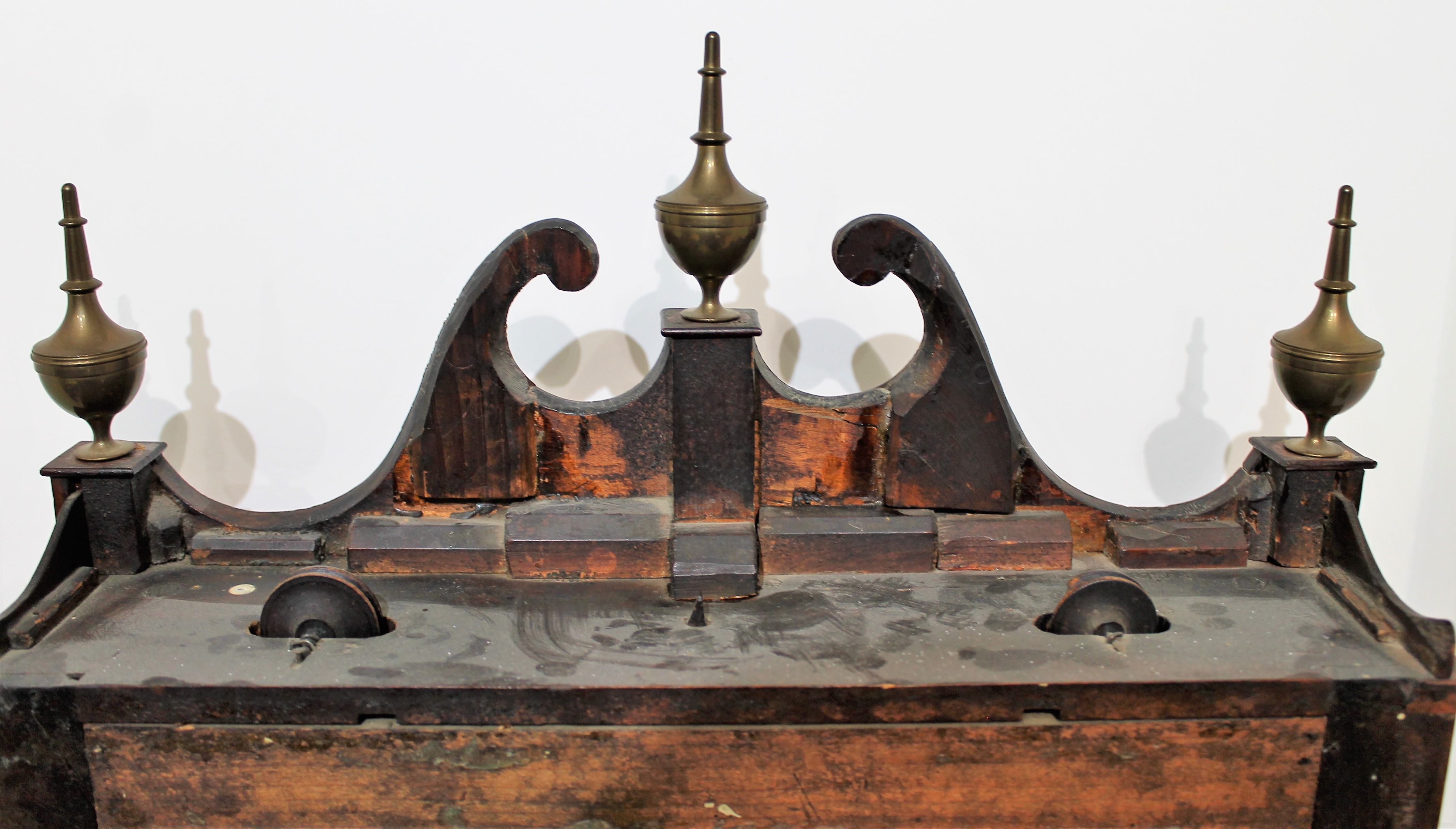 original; the scroll top has been repaired more than once and strengthened from behind. The brass urn finials are heavy with